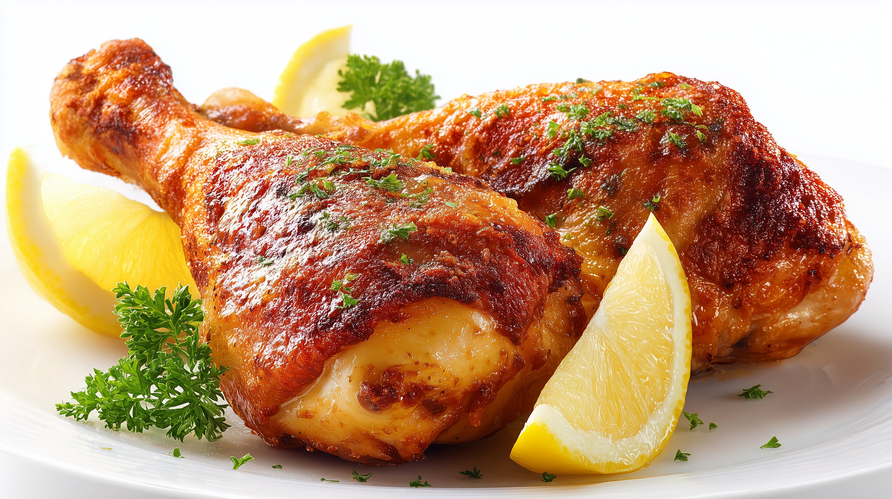 - Die fertigen Hähnchenkeulen kurz ruhen lassen, mit frischer Petersilie bestreuen und mit Zitronenspalten servieren.