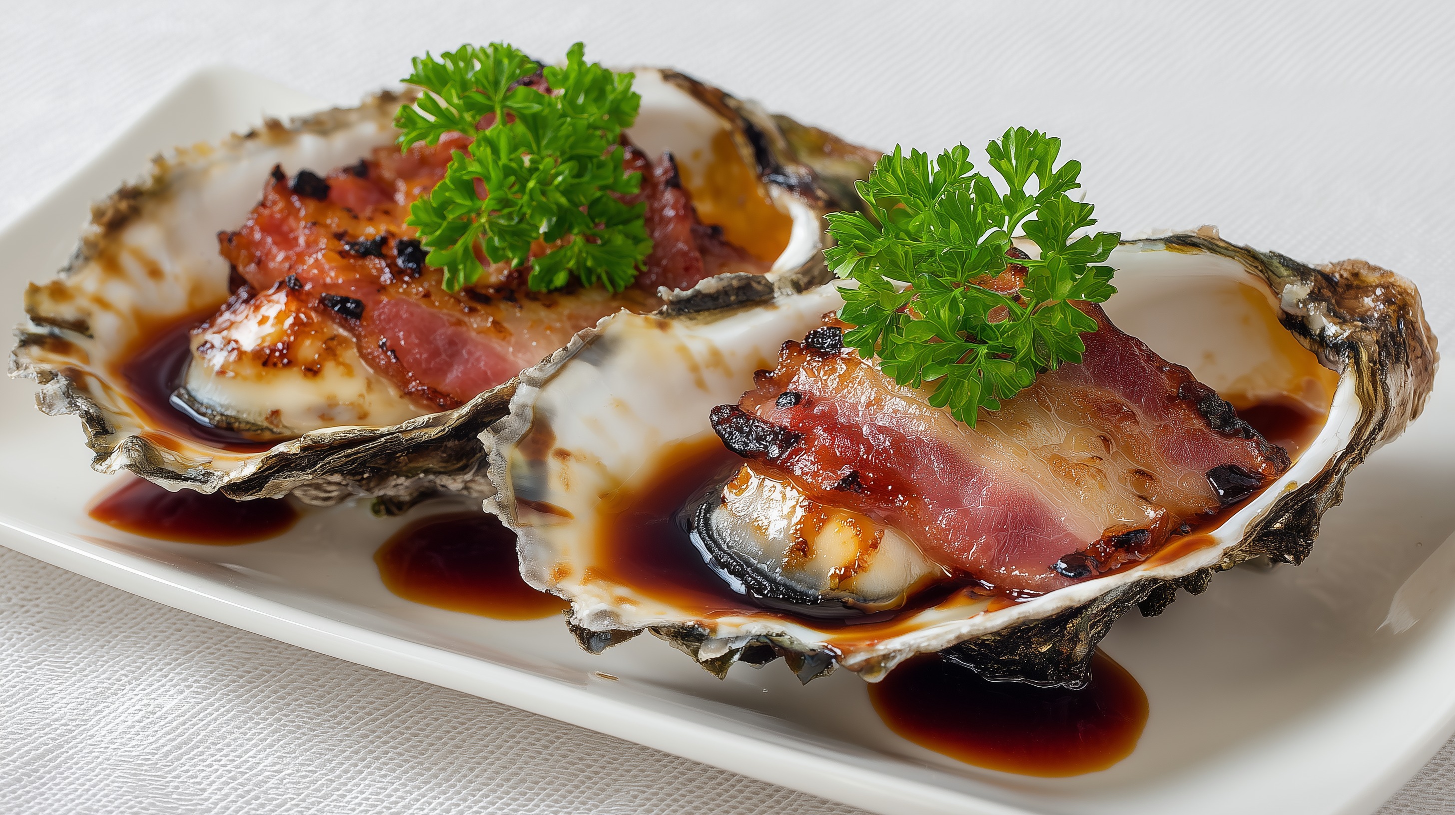 - Das Backblech auf der obersten Schiene in den vorgeheizten Ofen schieben und die Austern 8–10 Minuten garen, bis der Speck knusprig und leicht karamellisiert ist und die Ränder der Austern sich leicht kräuseln.