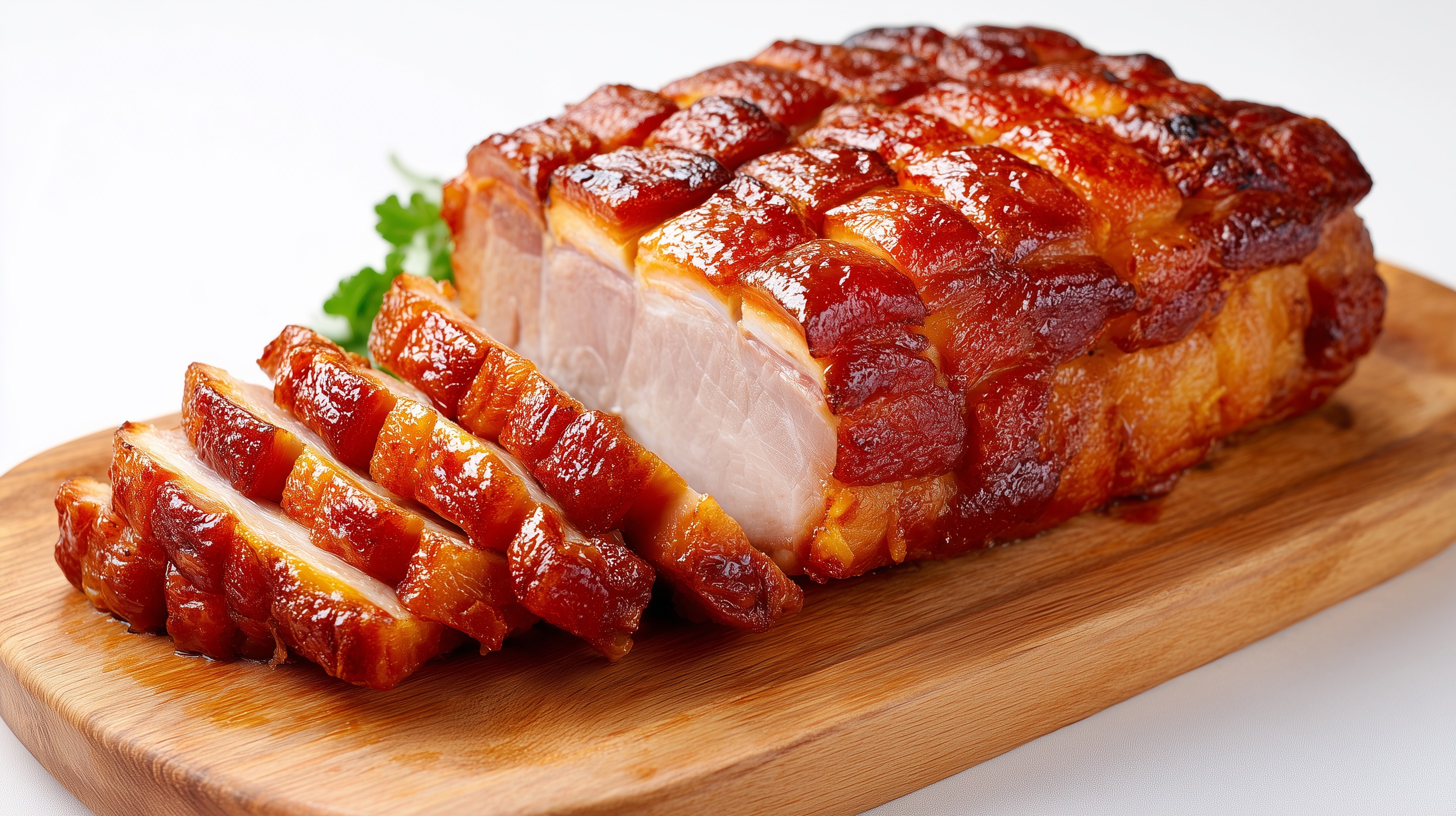 - Den Backschinken aus dem Ofen nehmen und 10 Minuten ruhen lassen. Dann in gleichmäßige Scheiben schneiden, auf dem Holzbrett anrichten und mit frischer Petersilie garnieren.