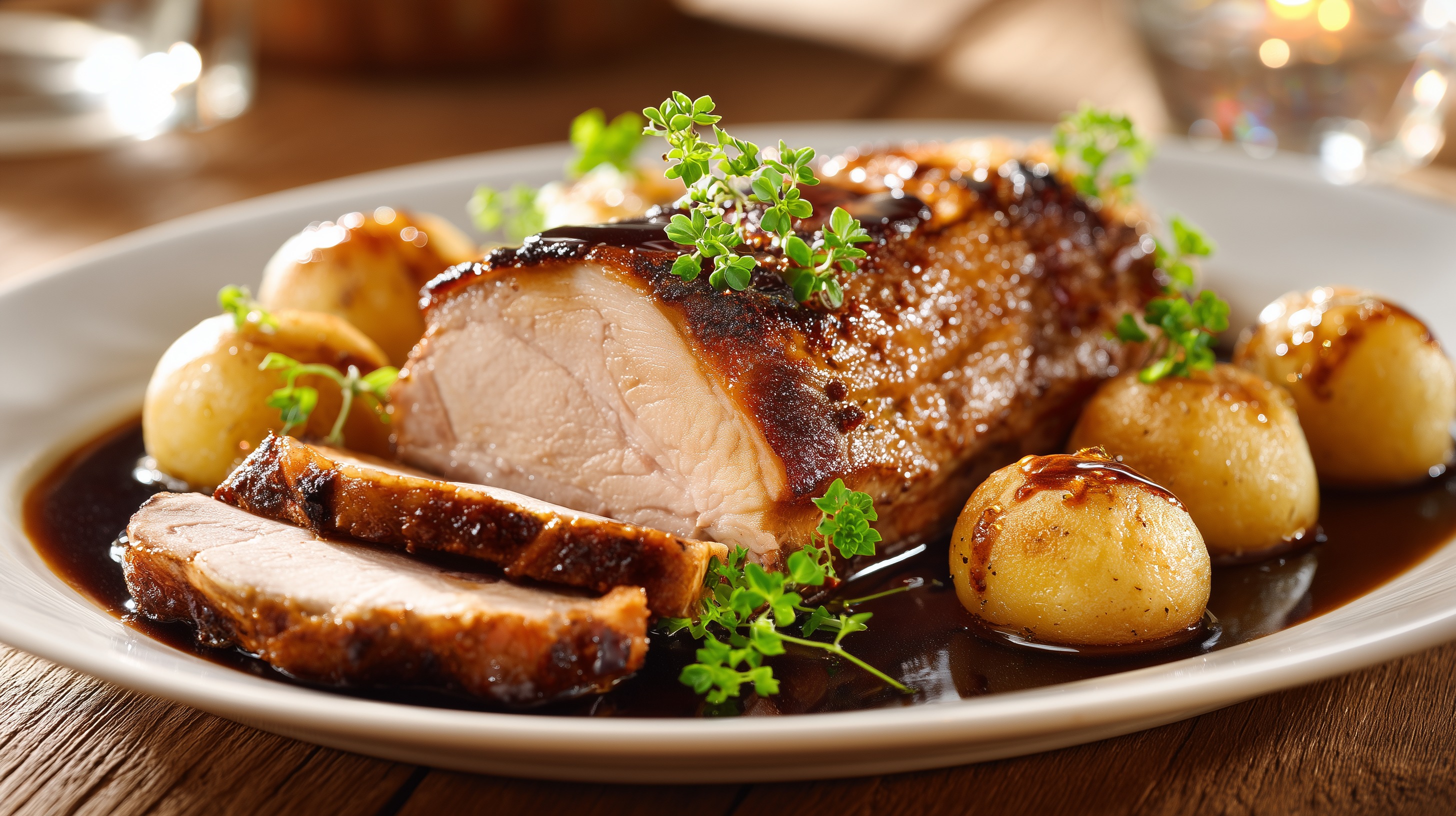 - Den Braten in Scheiben schneiden, mit den Kartoffeln auf Tellern anrichten und die Sauce darüber gießen. Mit frischem Thymian garnieren und sofort servieren.