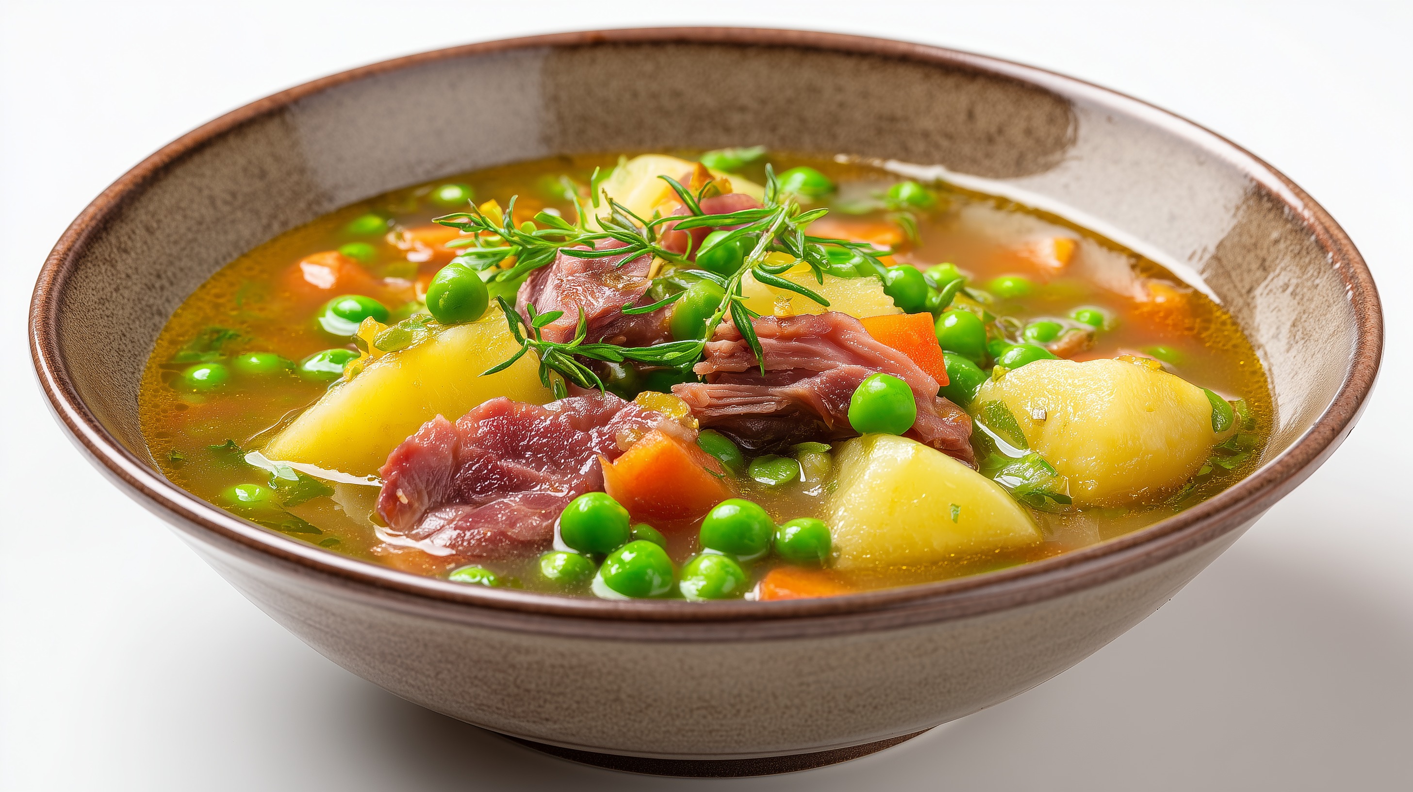 - Hitze reduzieren und die Suppe bei geschlossenem Deckel ca. 40 Minuten köcheln lassen, bis die getrockneten Erbsen weich sind.