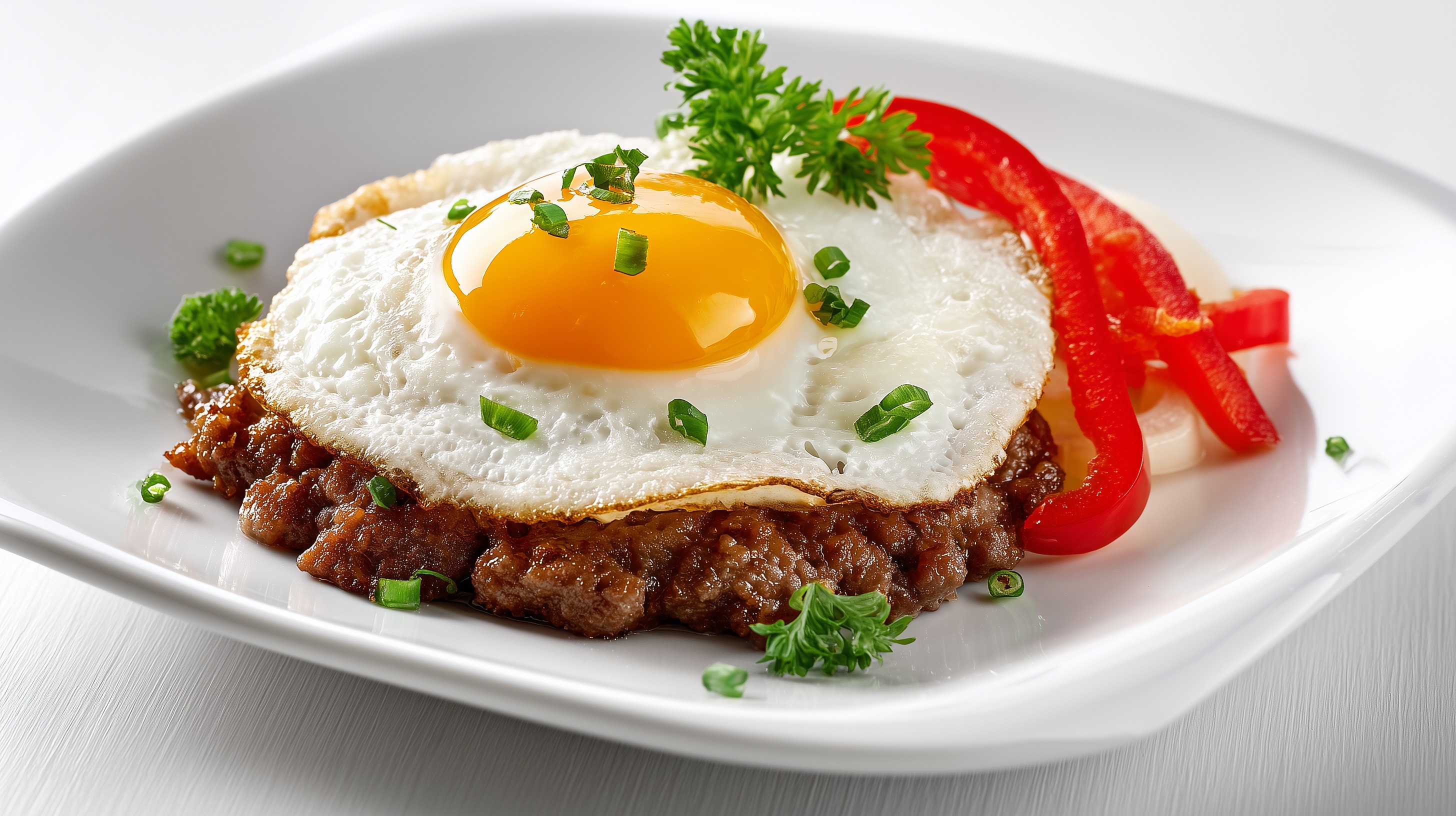 - Jeweils eine Frikadelle auf einem Teller anrichten, das Spiegelei obenauf legen. Mit Paprikastreifen, Frühlingszwiebelringen und frischer Petersilie garnieren und sofort servieren.