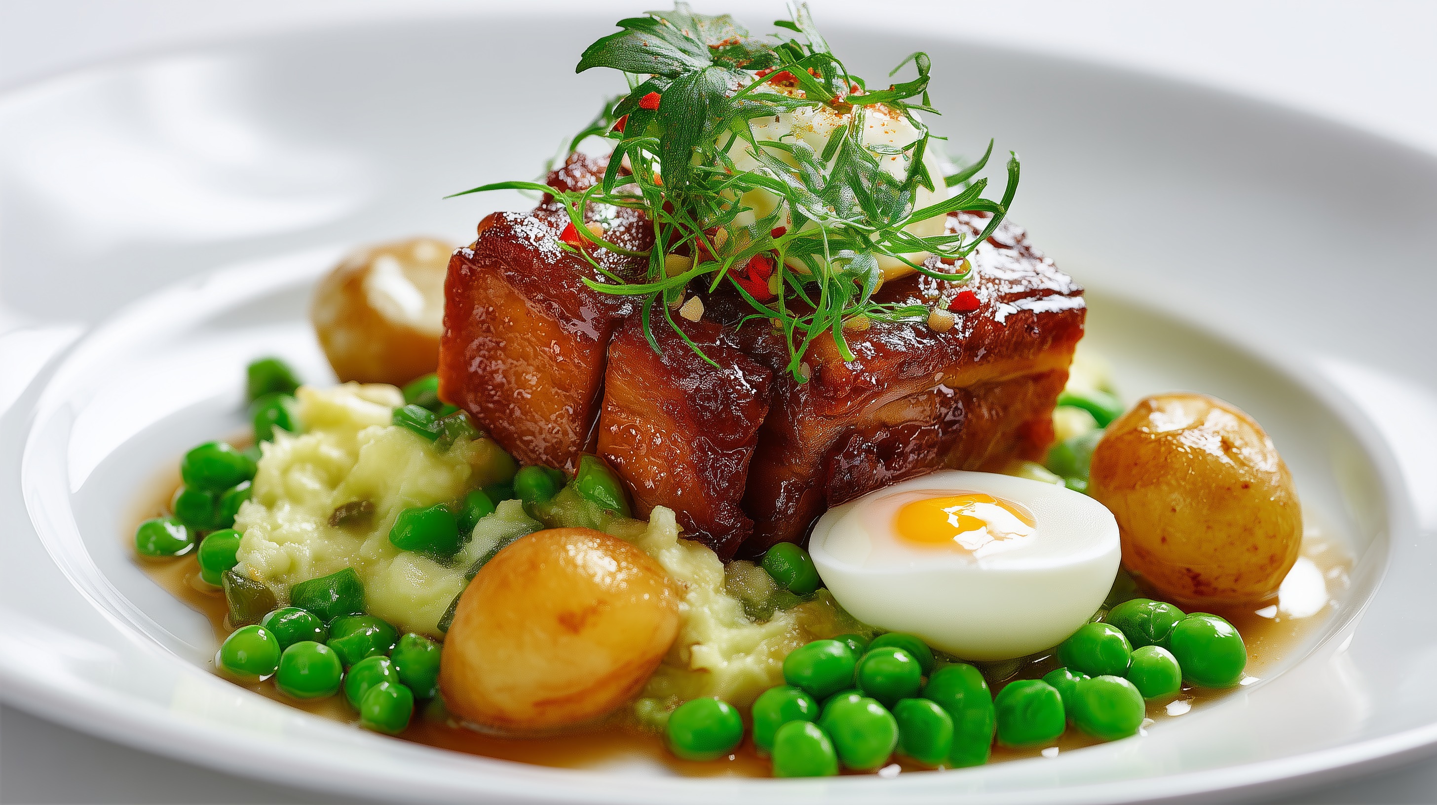 - Erbsenpüree kochen: In einem separaten Topf das Butterschmalz erhitzen und den Speck sowie die Zwiebel darin glasig anschwitzen. Die abgegossenen Erbsen dazugeben und mit der Brühe aufgießen. Bei mittlerer Hitze ca. 45–60 Minuten weich kochen, bis die Erbsen zerfallen. Bei Bedarf etwas Wasser oder Brühe nachgießen. Anschließend mit einem Kartoffelstampfer oder Löffel zu einem cremigen Püree stampfen, die Butter unterrühren und mit Salz, Pfeffer und Muskatnuss abschmecken.