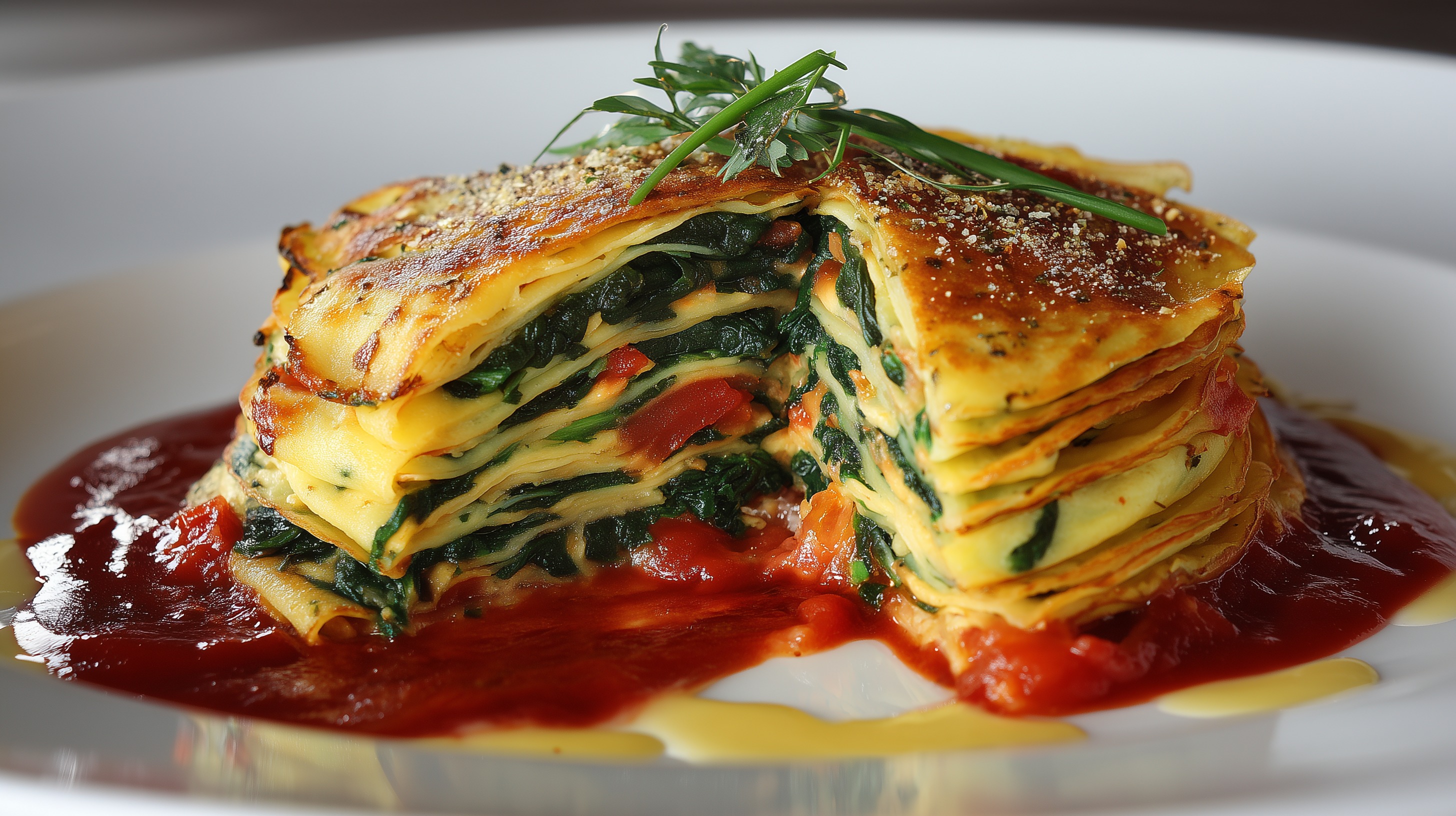 - Anrichten: Die Tomatensauce auf vorgewärmten Tellern verteilen. Je ein Stück der Pfannkuchentorte daraufsetzen und mit frischen Kräutern garnieren. Sofort servieren.