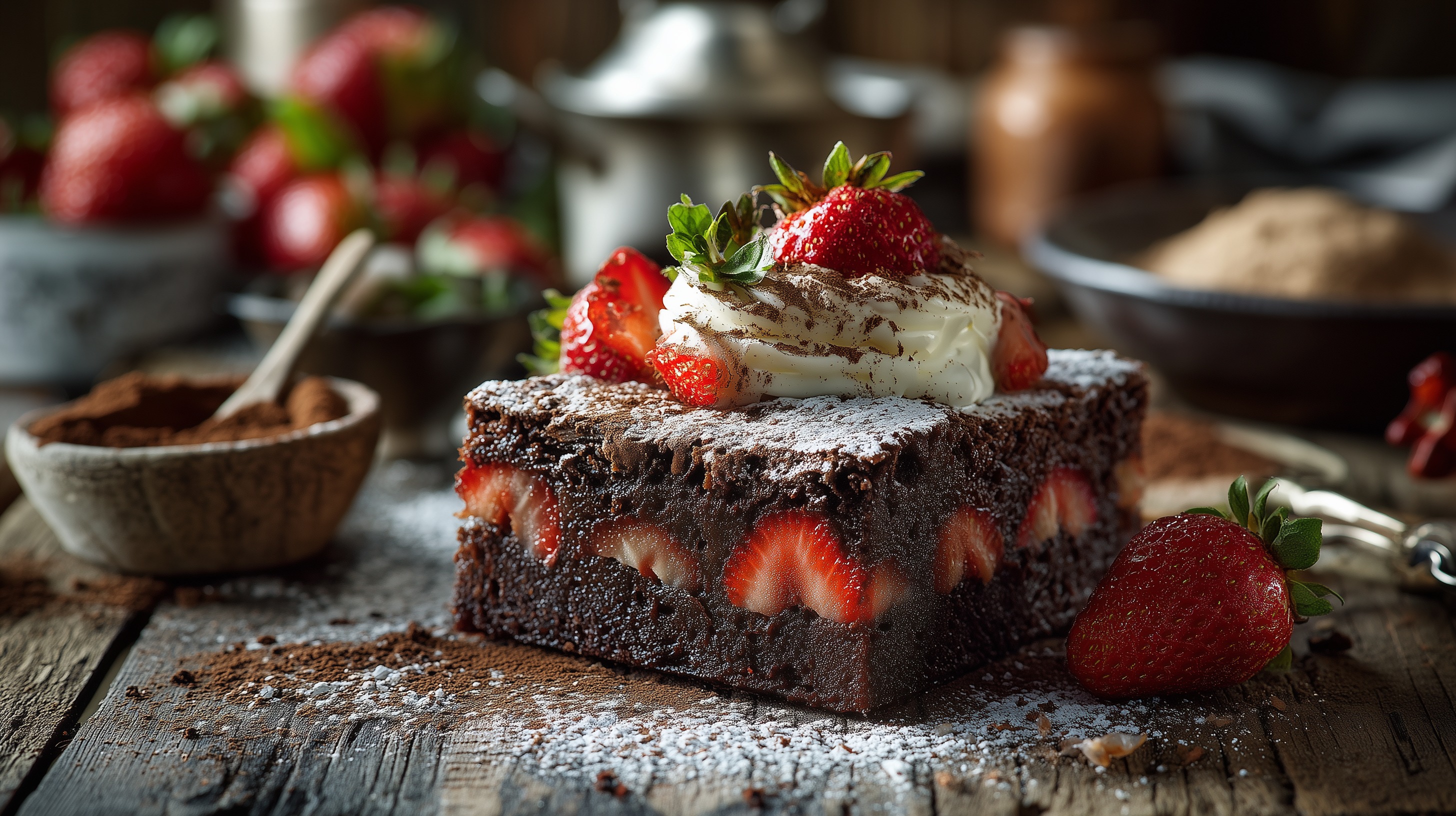 - Den abgekühlten Brownie in 4 gleichmäßige Stücke schneiden. Auf jeden Brownie einen großzügigen Klecks Quarkcreme geben, mit den restlichen frischen Erdbeeren dekorieren und leicht mit Puderzucker sowie Kakaopulver bestäuben.