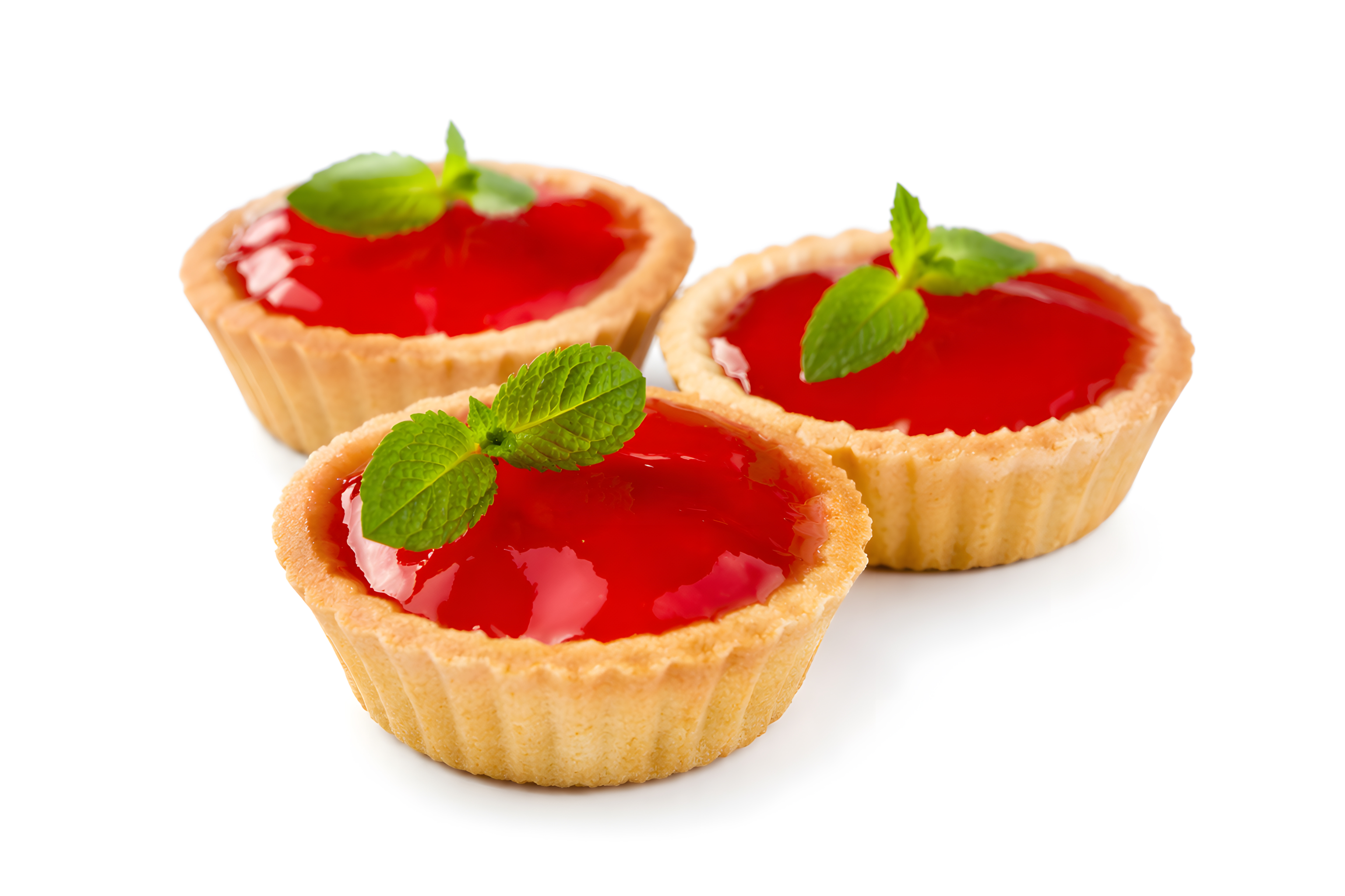 Das Foto zeigt drei kleine Mürbeteig-Törtchen in der klassischen Tartelette-Form, die auf einem weißen Hintergrund freigestellt präsentiert werden. Die goldbraun gebackenen, gerillten Teigschalen sind mit einer leuchtend roten, glänzenden Gelee-Füllung gefüllt, die an Erdbeer- oder Himbeergelee erinnert. Jedes Törtchen ist mit einem frischen, grünen Minzblatt als Garnierung dekoriert, was einen ansprechenden Farbkontrast zur roten Füllung schafft.