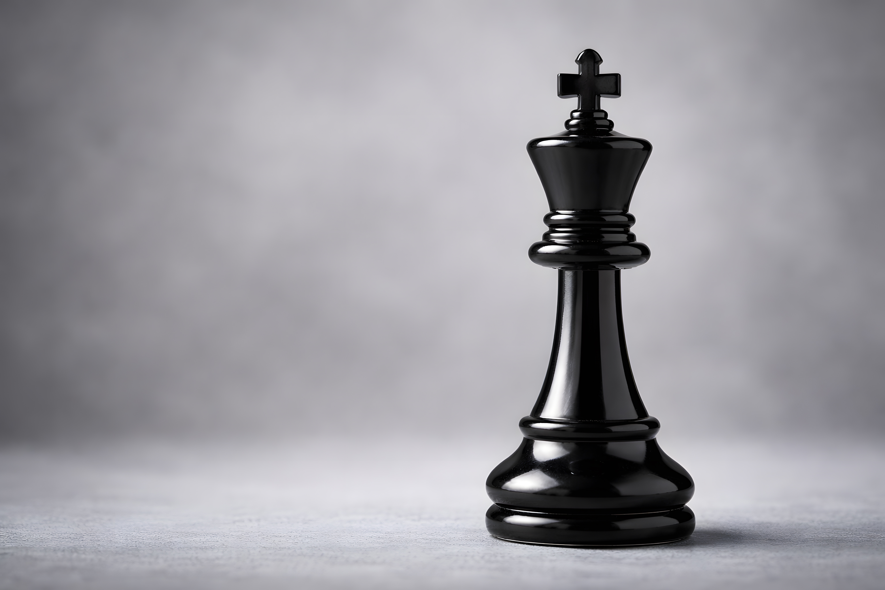 Diese professionelle Studioaufnahme zeigt eine glänzend schwarze Schachfigur – den König – in einer stimmungsvollen Nahaufnahme vor einem neutralen grauen Hintergrund. Die Figur ist aus dunklem, hochglanzpoliertem Material gefertigt und weist das typische Kreuz an der Spitze auf, das den König im Schachspiel eindeutig kennzeichnet.