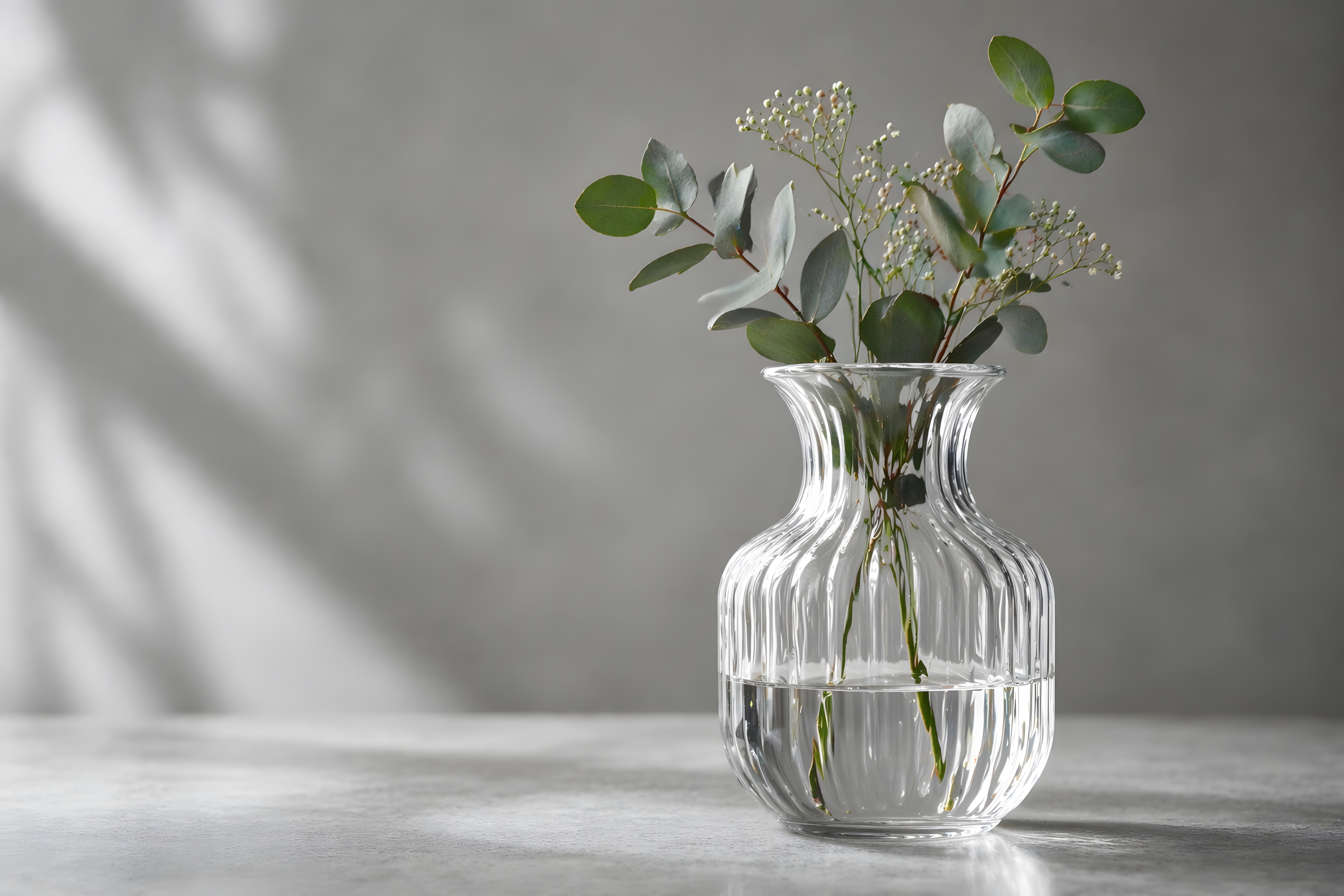 Dieses ruhige Stillleben zeigt eine transparente, gerippte Glasvase mit elegantem Schwung, gefüllt mit frischen Eukalyptuszweigen und zartem Schleierkraut. Die runden, blaugrünen Blätter des Eukalyptus kontrastieren sanft mit den kleinen weißen Blütenknospen des Schleierkrauts. In der Vase ist klares Wasser sichtbar, durch das die Stiele hindurchscheinen.