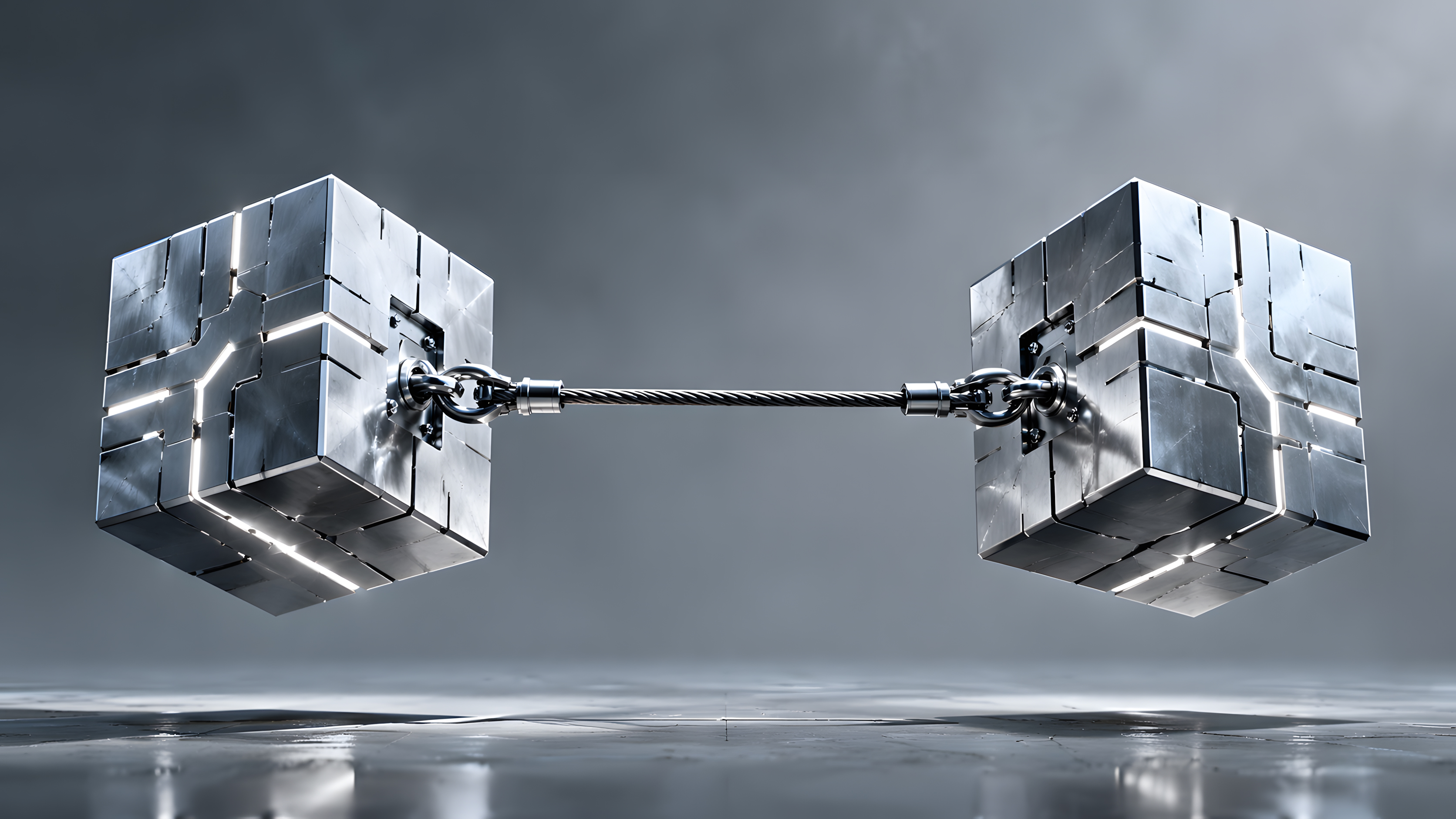 Diese hochwertige 3D-Visualisierung zeigt zwei massive, schwebende Metallwürfel aus poliertem Stahl, die durch ein gedrehtes Stahlseil miteinander verbunden sind. Die Würfel bestehen aus einzelnen, strukturierten Segmenten mit feinen Lichtakzenten an den Kanten, was ihnen eine technische und zugleich ästhetische Wirkung verleiht. Das Seil ist an beiden Enden mit massiven Metallverbindern und kleinen Kettengliedern befestigt und streckt sich horizontal durch das Bild.
