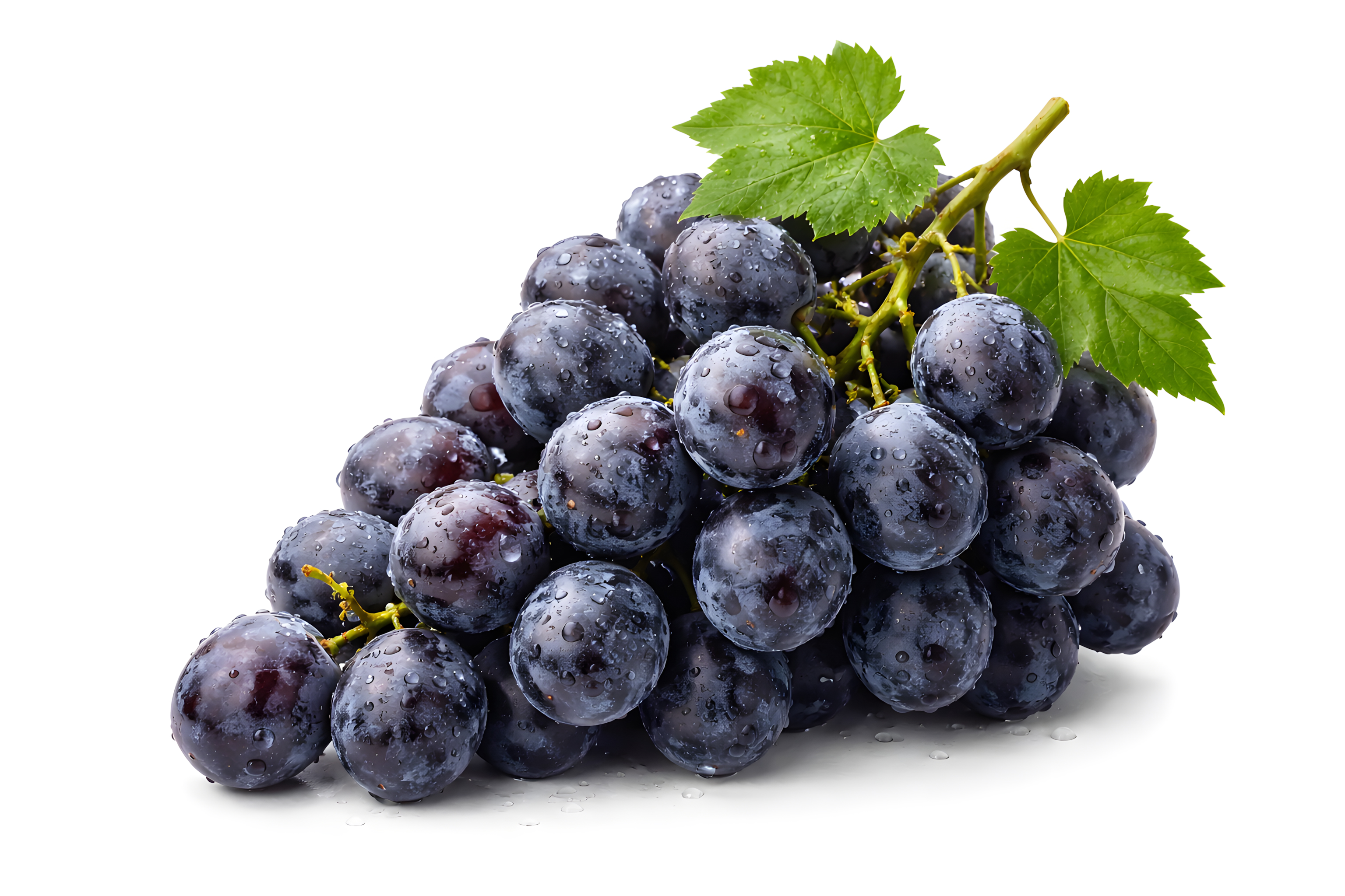 Dieses hochwertige Produktfoto zeigt eine üppige Traube frischer, dunkelblauer Weintrauben auf weißem Hintergrund. Die einzelnen Beeren glänzen mit feinen Wassertropfen, die ihre Frische und Qualität unterstreichen. Die tief violett-blaue Farbe der Beeren wirkt satt und natürlich, während die leuchtend grünen Weinblätter am Stiel einen schönen Farbkontrast bilden.
