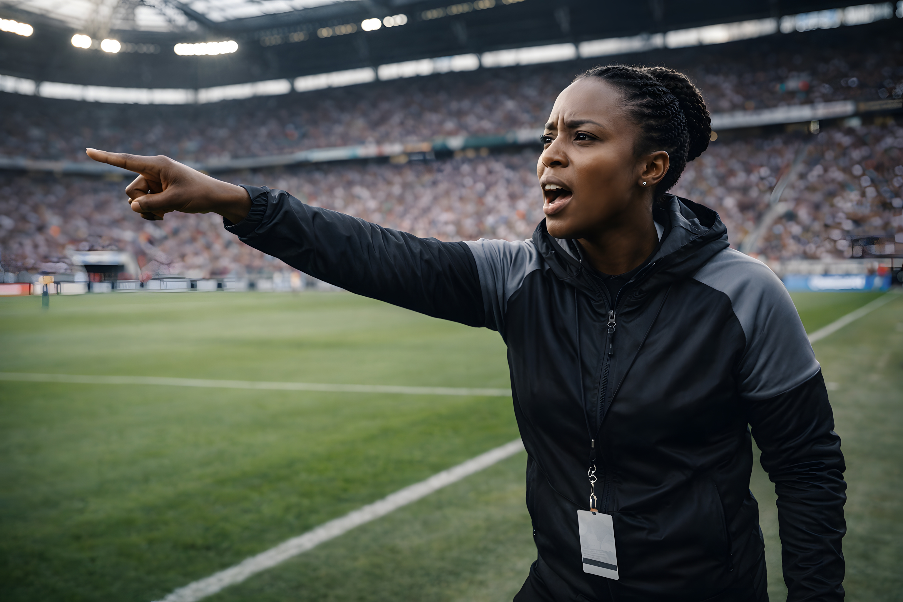 Das Foto zeigt eine Frau in einer schwarzen Sportjacke, die energisch mit ausgestrecktem Zeigefinger Anweisungen gibt. Sie steht am Rand eines Fußballspielfelds in einem großen, gut gefüllten Stadion. Ihr Gesichtsausdruck ist fokussiert und bestimmt, der Mund leicht geöffnet, als würde sie rufen oder Kommandos geben. An ihrem Hals hängt ein Akkreditierungsausweis, der auf eine offizielle Funktion als Trainerin oder Betreuerin hindeutet.