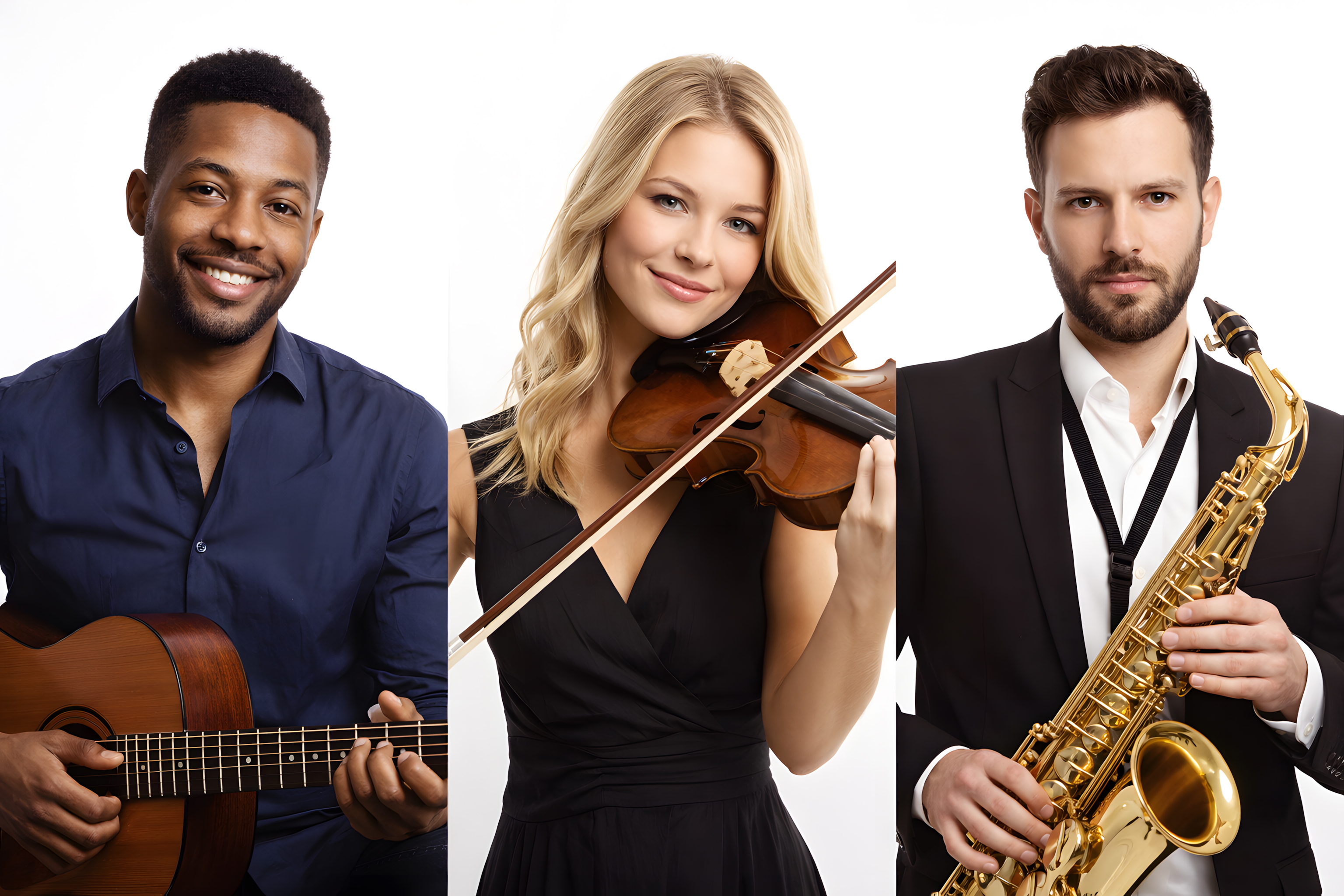 Dieses professionelle Studiofoto zeigt drei Musiker vor einem schlichten weißen Hintergrund. Von links nach rechts: ein lächelnder Mann in einem dunkelblauen Hemd, der eine akustische Gitarre hält, eine junge Frau in einem schwarzen Abendkleid, die eine Violine und einen Bogen elegant positioniert, sowie ein Mann im schwarzen Anzug, der ein goldenes Altsaxofon trägt.