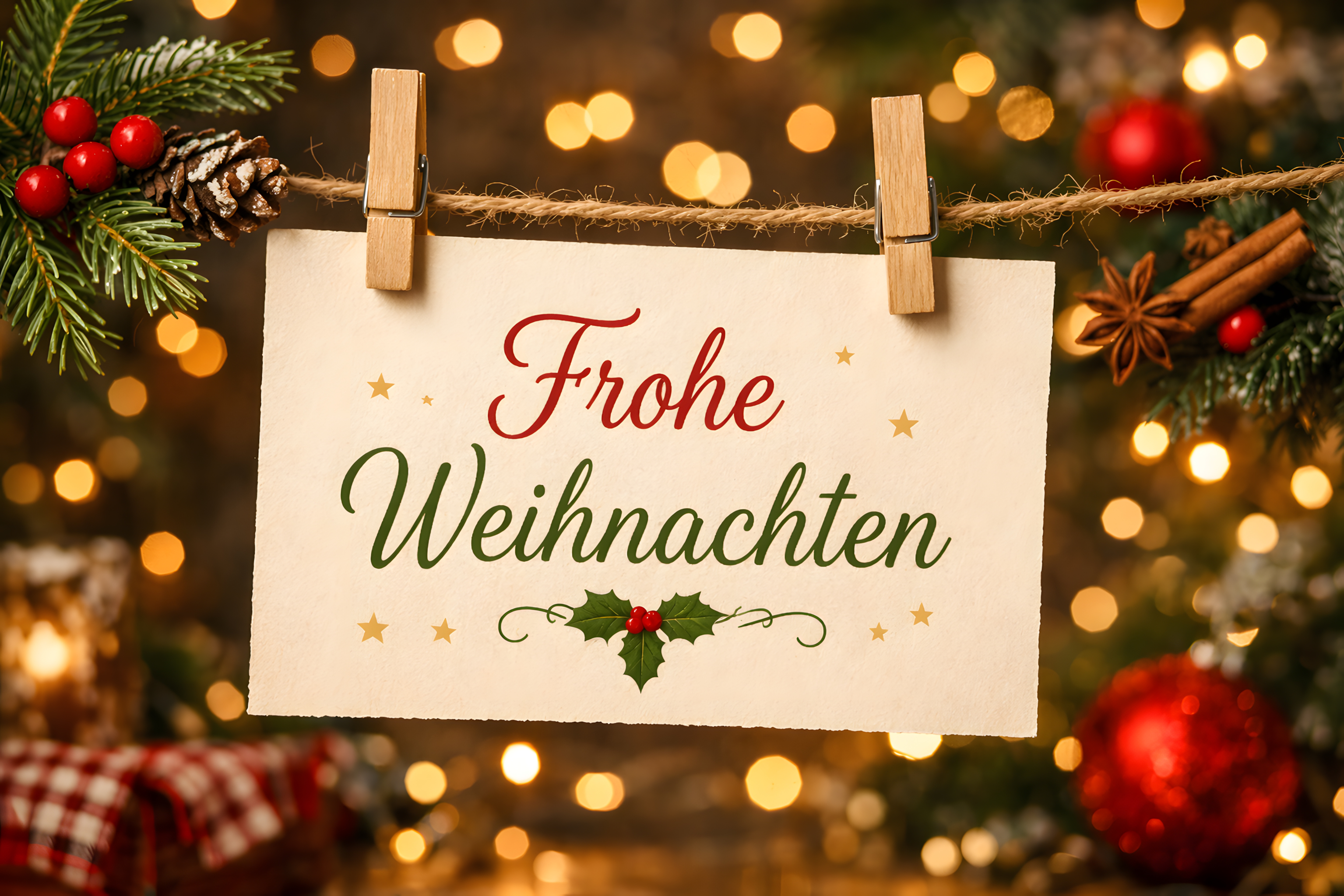 Dieses stimmungsvolle Weihnachtsbild zeigt eine cremefarbene Grußkarte mit dem deutschen Schriftzug «Frohe Weihnachten» in elegantem Kalligrafie-Stil. Die Karte ist mit zwei Holzwäscheklammern an einer Jute-Schnur befestigt und hängt vor einem warm beleuchteten Bokeh-Hintergrund, der eine besonders festliche Atmosphäre erzeugt.