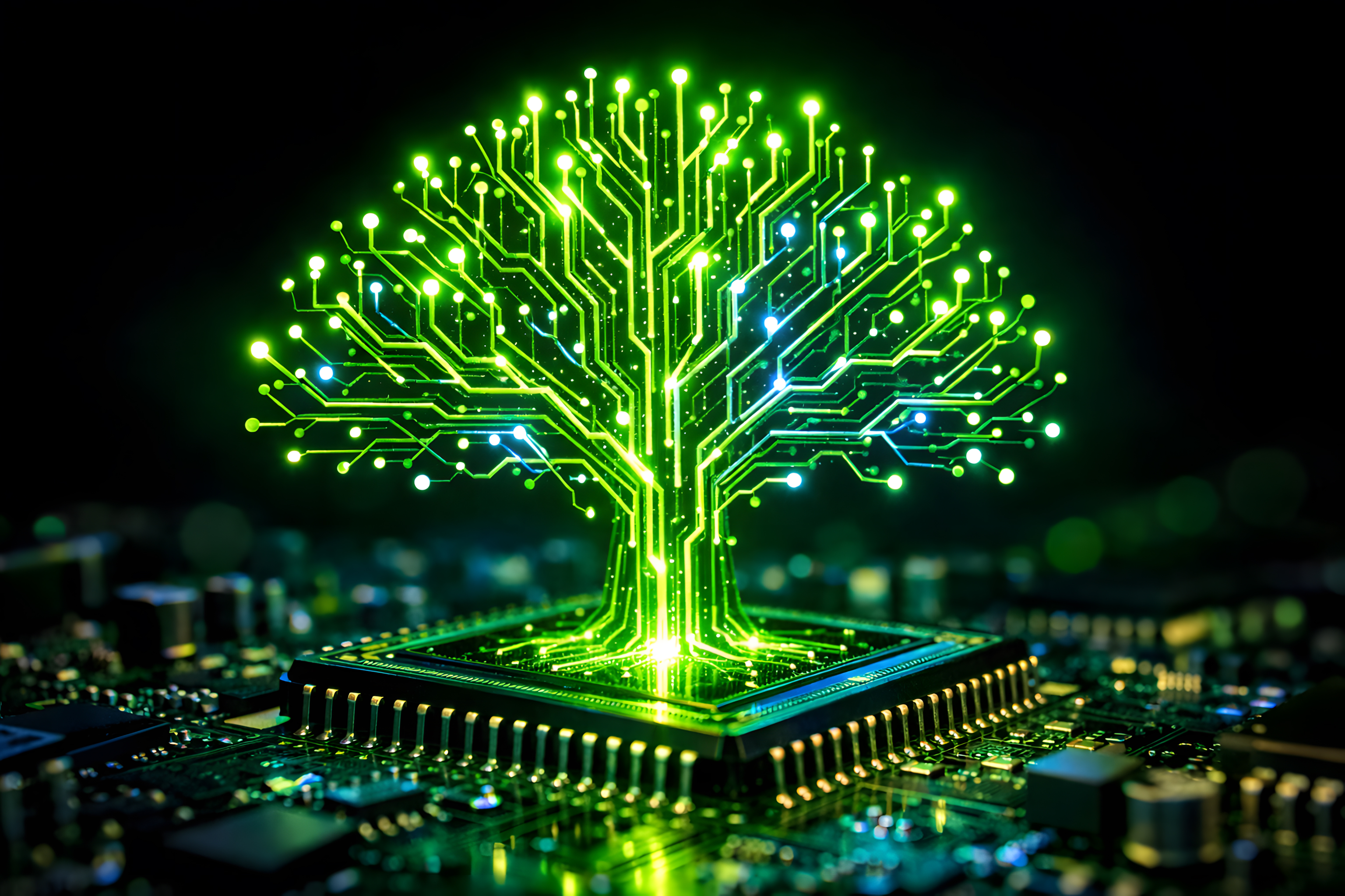 Dieses beeindruckende Konzeptbild zeigt einen leuchtend grünen Schaltkreis-Baum, der direkt aus einem zentralen CPU-Chip auf einer Leiterplatte herauswächst. Die verzweigten Leiterbahnen imitieren organische Äste und enden in hellen Lichtpunkten, die an Blätter oder Synapsen erinnern. Die intensive Neon-Grün-Färbung hebt sich stark vom dunklen, fast schwarzen Hintergrund ab und erzeugt eine dramatische, futuristische Atmosphäre.