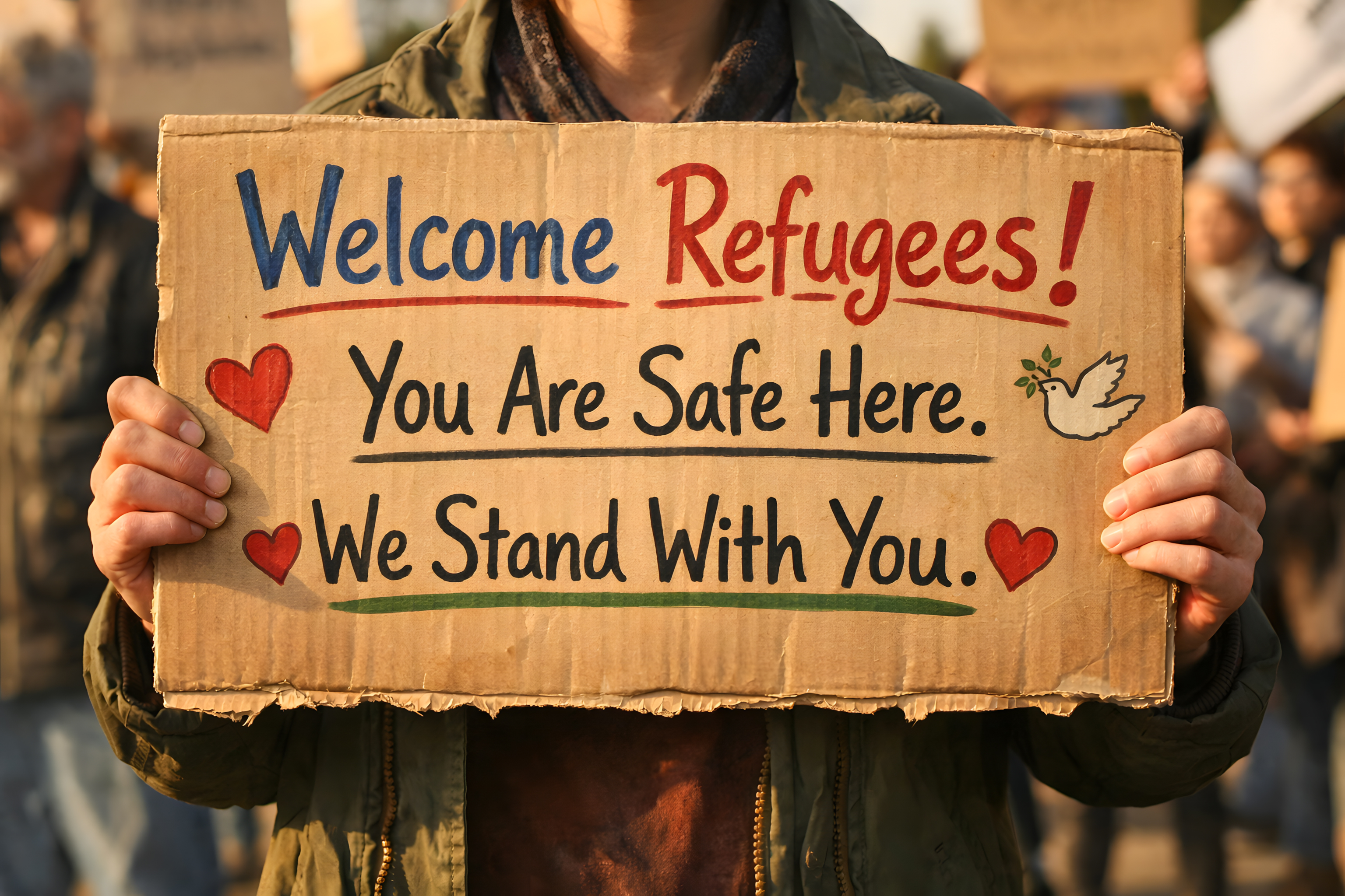 Das Foto zeigt eine Person, die ein handgeschriebenes Pappschild bei einer Demonstration in die Kamera hält. Auf dem Schild steht in bunten Buchstaben: «Welcome Refugees! You Are Safe Here. We Stand With You.» Die Schrift ist in Blau, Rot und Schwarz gehalten und mit roten Herzen sowie einer weißen Friedenstaube mit Olivenzweig verziert.