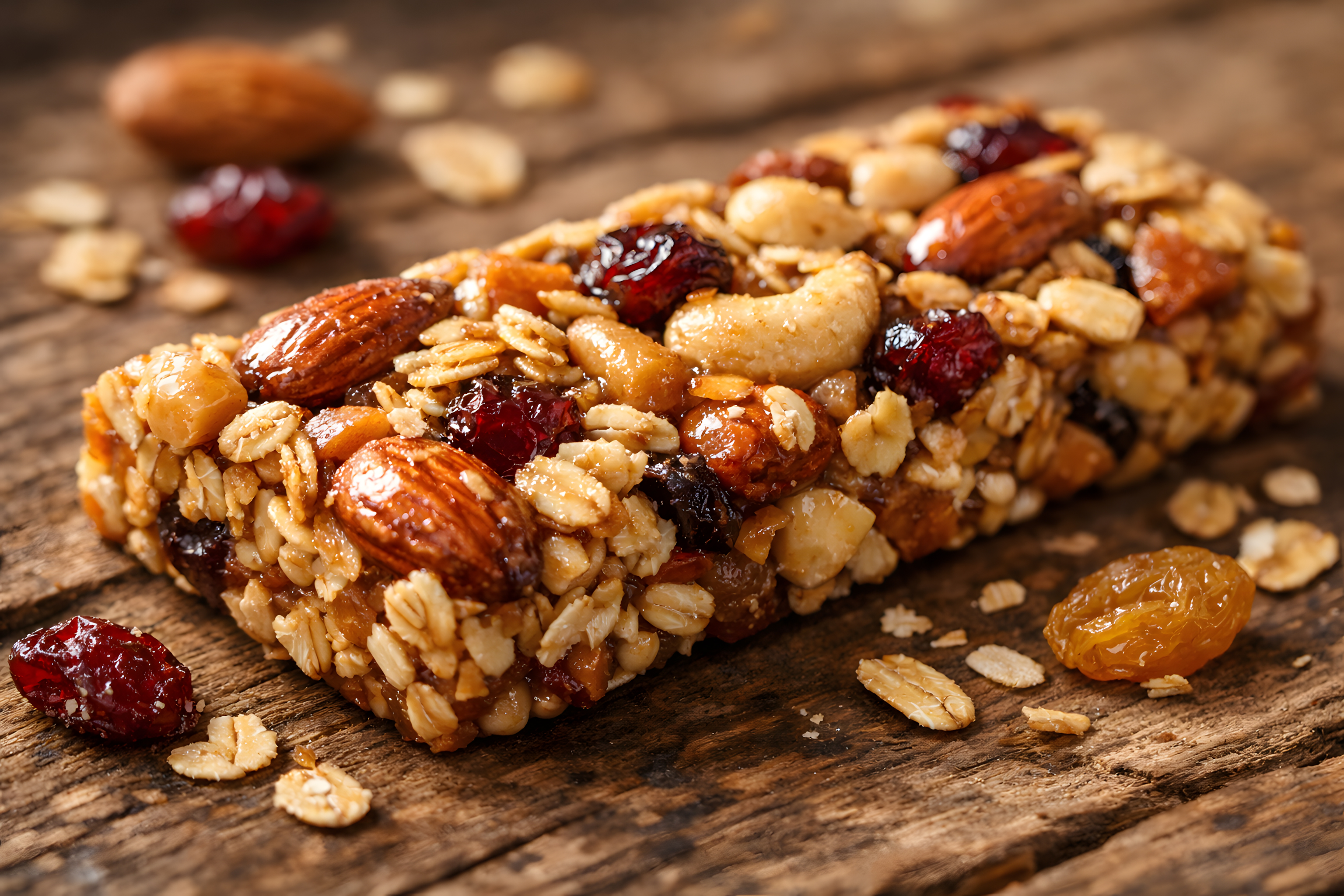 Dieses Foto zeigt einen sorgfältig komponierten Müsliriegel in Nahaufnahme, der auf einer rustikalen Holzoberfläche liegt. Der Riegel ist reich bestückt mit ganzen Mandeln, Cashewkernen, getrockneten Cranberries und goldenen Rosinen, eingebettet in eine knusprige Haferflocken-Basis, die mit einem glänzenden Honig- oder Sirupüberzug zusammengehalten wird.