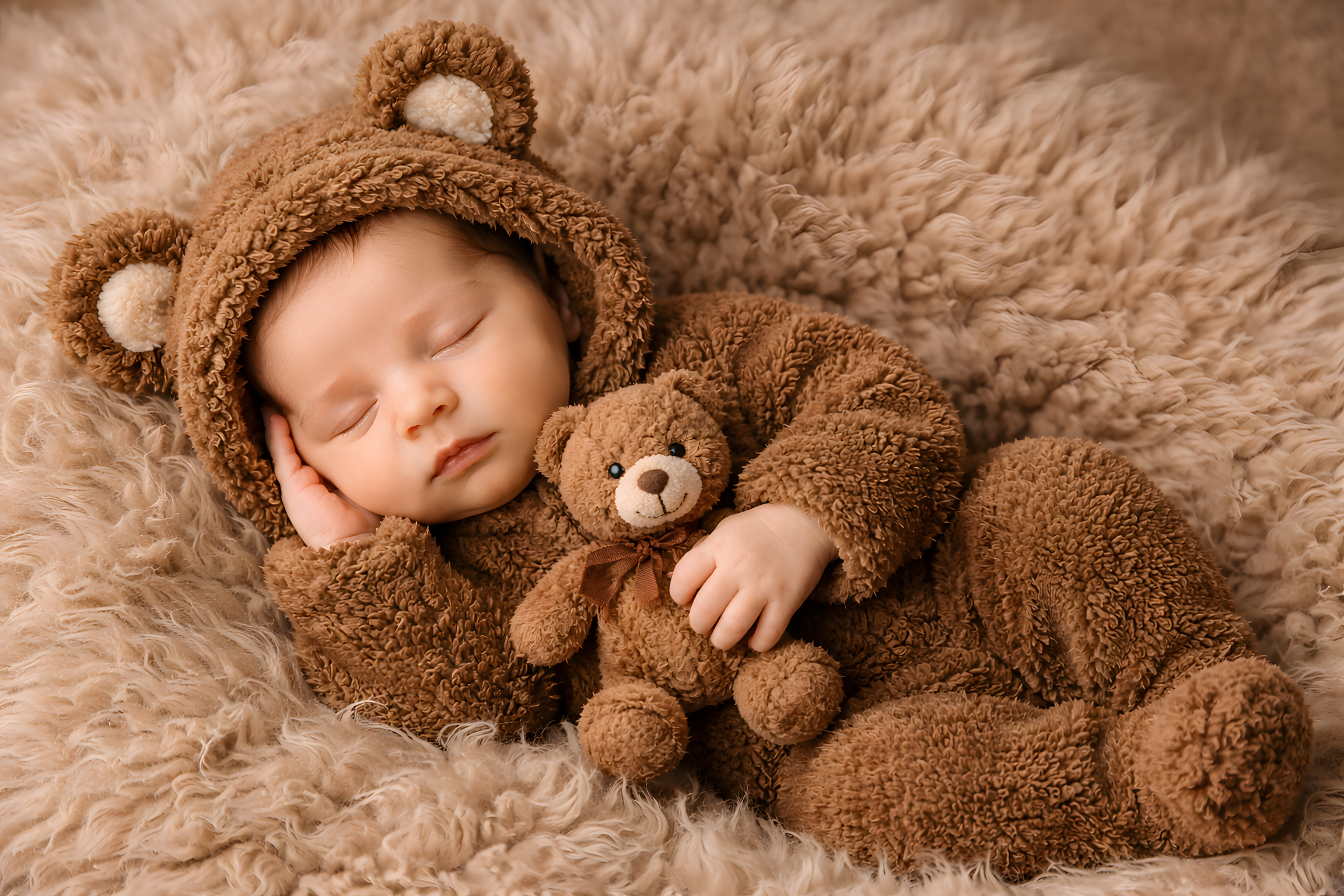 Das Kind liegt entspannt auf einem weichen, cremefarbenen Schaffell, das die warmen Brauntöne des Kostüms harmonisch ergänzt. Die gesamte Farbpalette aus Beige, Camel und Schokoladenbraun erzeugt eine ruhige, natürliche Atmosphäre. Die Nahaufnahme betont die weichen Gesichtszüge des schlafenden Neugeborenen und fängt einen stillen, friedvollen Moment ein.