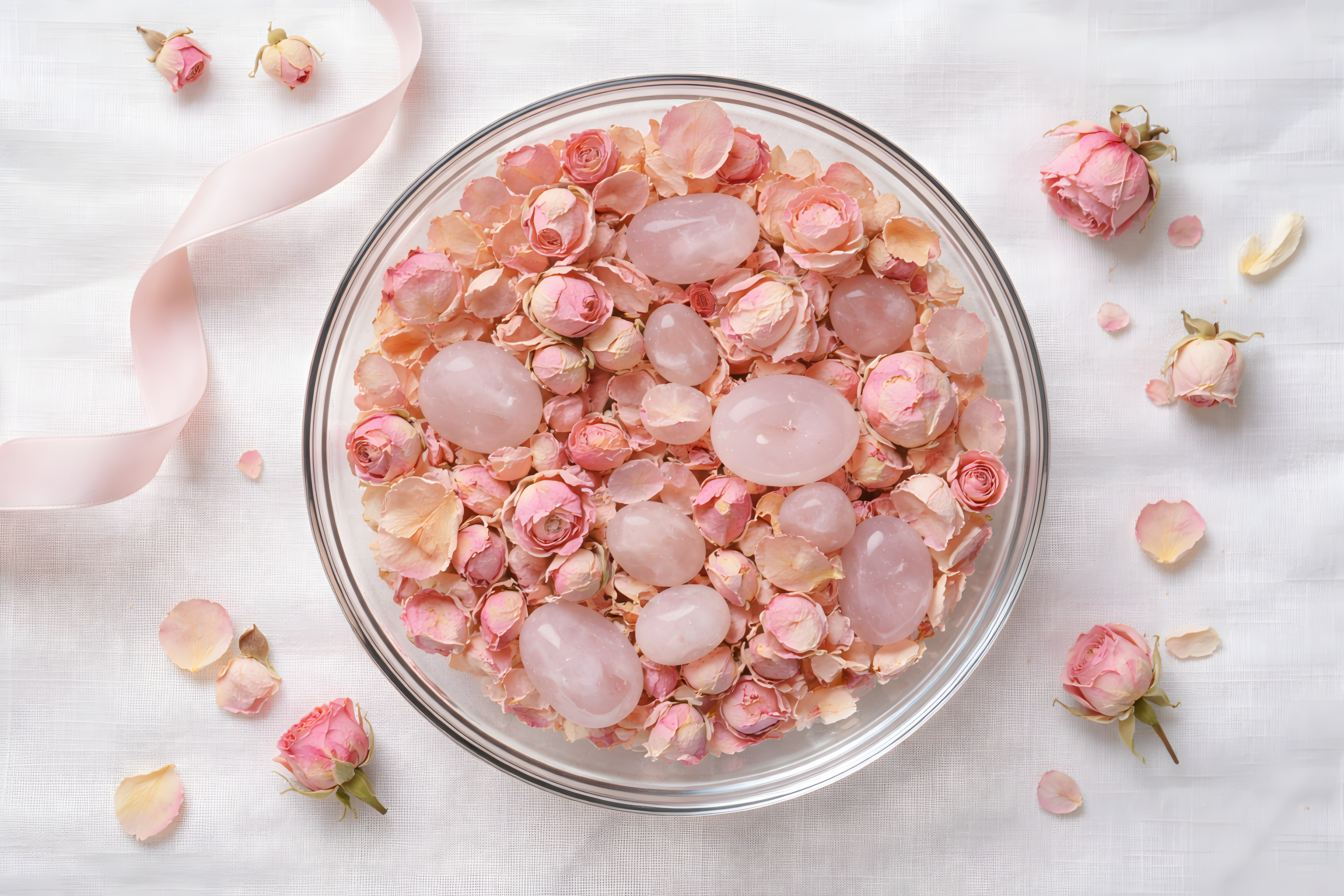 Neben der Schale sind einzelne Rosenknospen und Blütenblätter locker auf einem weißen Leinenstoff verstreut. Ein zartes Seidenband in Hellrosa liegt elegant neben der Schale und unterstreicht den romantischen, femininen Charakter des Bildes. Die Farbpalette bleibt durchgehend in sanften Pastelltönen, was eine ruhige und edle Atmosphäre erzeugt.