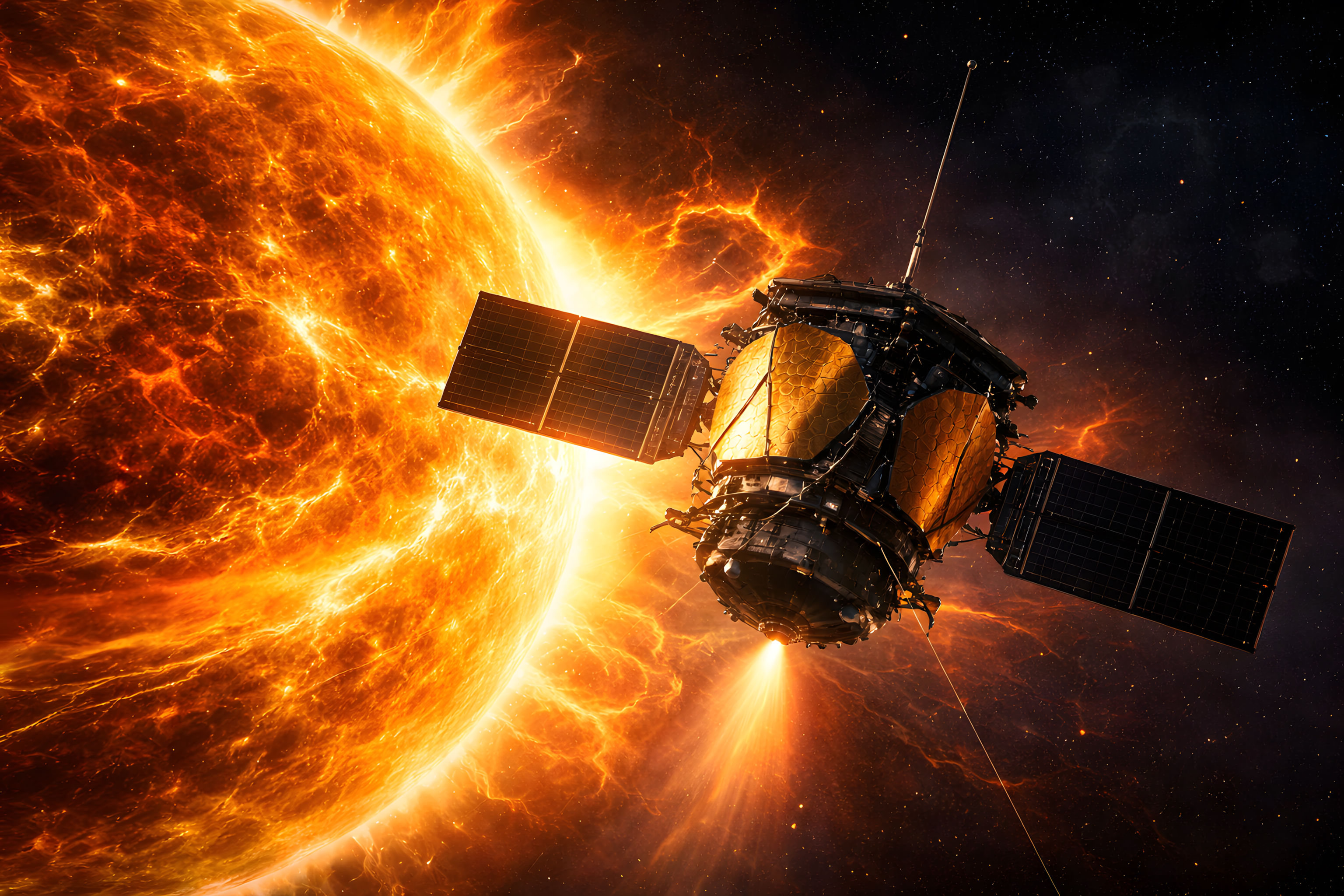 Die Komposition ist aus einer leichten Untersicht gewählt, was der Raumsonde eine imposante Wirkung verleiht. Im Hintergrund ist der schwarze, sternengesprengte Weltraum zu sehen, der einen starken Kontrast zur glühenden Sonnenatmosphäre bildet. Die detaillierte Darstellung technischer Bauteile wie Antennen, Triebwerke und modularer Strukturen verleiht dem Bild eine hohe Glaubwürdigkeit.