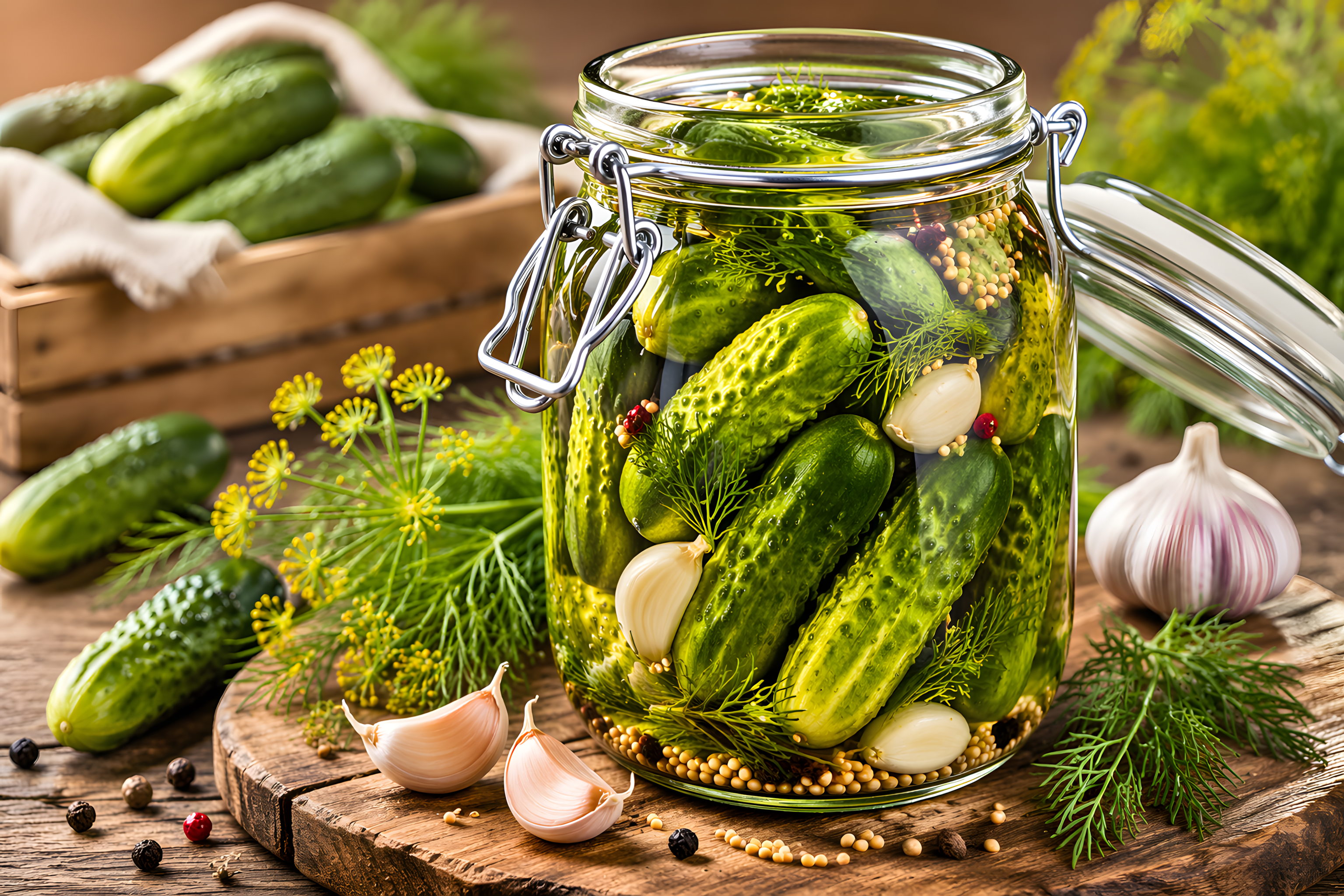 Das Glas steht auf einem rustikalen Holzbrett, umgeben von weiteren Zutaten: einzelne Knoblauchzehen und eine ganze Knoblauchknolle liegen daneben, ebenso Dillblüten und lose Gewürze. Im Hintergrund ist eine Holzkiste mit frischen Salatgurken und Dillpflanzen zu sehen, was die landwirtschaftliche Herkunft der Zutaten unterstreicht.