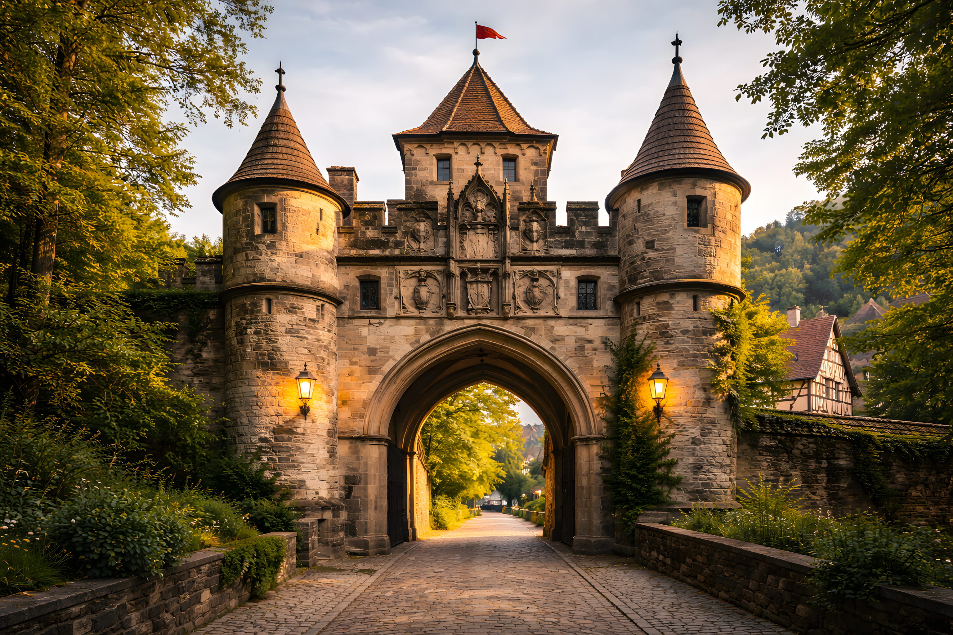 Dieses beeindruckende Foto zeigt ein mittelalterliches Stadttor aus behauenem Sandstein, flankiert von zwei runden Wehrtürmen mit konischen Schieferdächern. Ein roter Wimpel ziert den zentralen Turm, während zwei warmgelb leuchtende Laternen die gotische Torbögenöffnung stimmungsvoll erhellen. Der Blick führt durch den Rundbogen auf eine Kopfsteinpflasterstraße, die in eine grüne Baumlandschaft mündet.