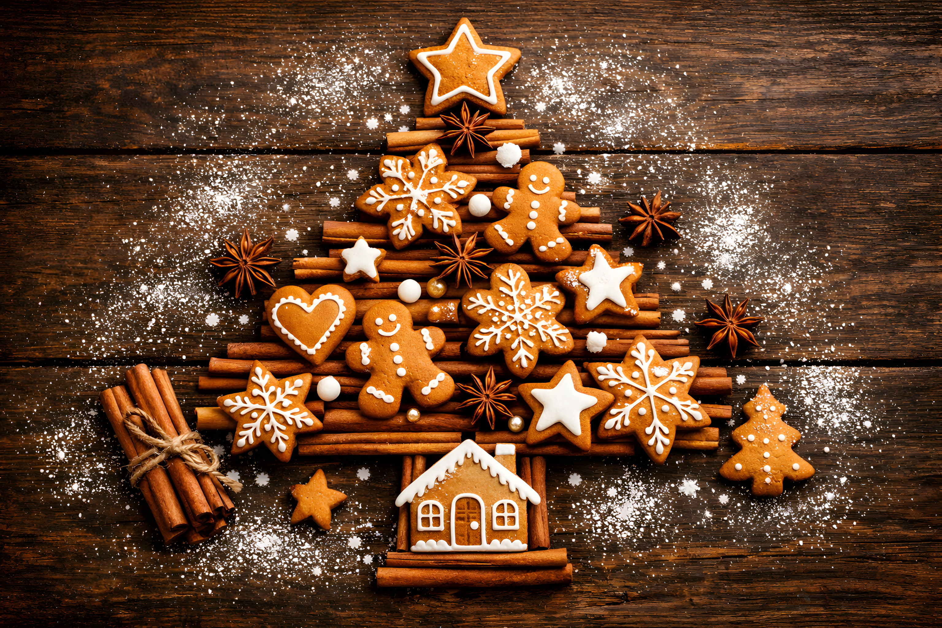 Diese stimmungsvolle Draufsicht zeigt einen kreativ arrangierten Weihnachtsbaum, der vollständig aus Zimtstangen, Lebkuchenplätzchen und Sternanis zusammengestellt wurde. Die Komposition liegt auf einem dunklen, rustikalen Holzhintergrund, der mit Puderzucker bestreut ist und an frisch gefallenen Schnee erinnert.