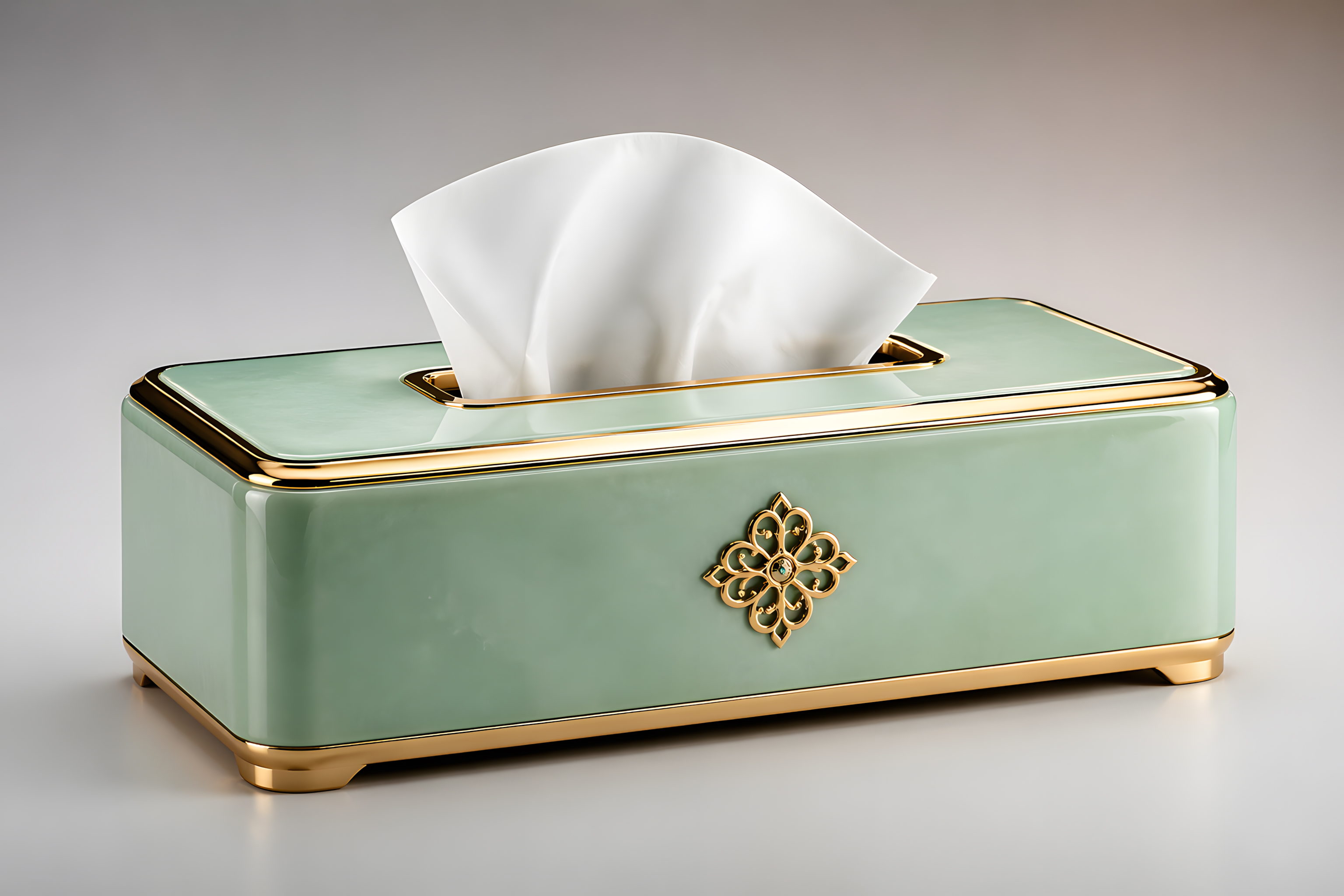 Durch den Schlitz im Deckel ragt ein weißes Taschentuch heraus, was die praktische Funktion des Objekts verdeutlicht. Die Aufnahme erfolgte aus einer leichten Froschperspektive vor einem neutralen hellgrauen Hintergrund, was das Motiv optimal freistellt und alle Details klar erkennbar macht. Das weiche Licht betont die glänzende Oberfläche der Box und das metallische Finish der Goldelemente.