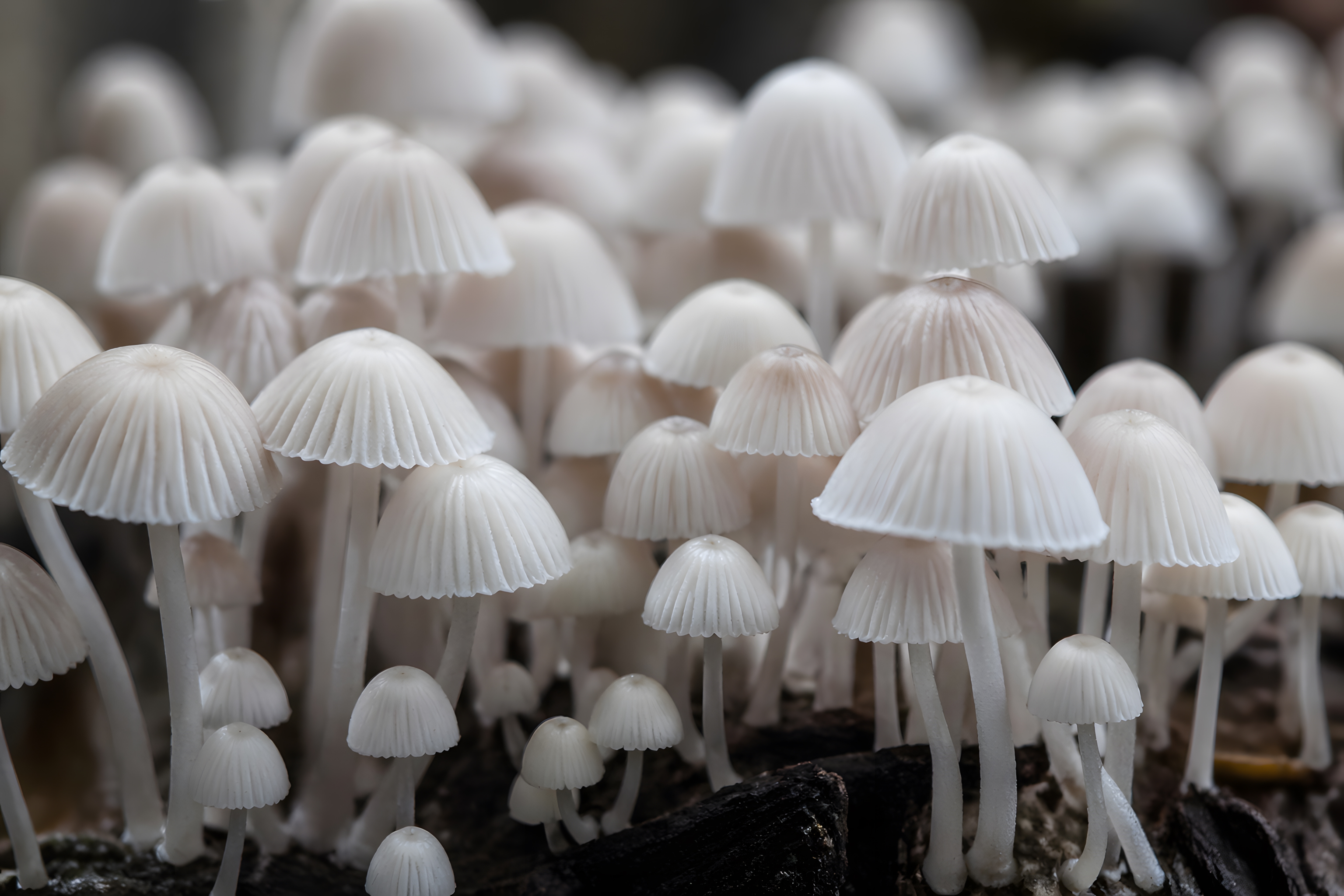 Dieses beeindruckende Naturfoto zeigt eine dichte Kolonie zarter, reinweißer Pilze, die auf verwittertem Totholz wachsen. Die Pilze besitzen fein gerippte, glockig-kegelförmige Hüte mit eleganten Lamellen, die an Miniaturschirme erinnern. Die Aufnahme wurde aus einer tiefen Froschperspektive gemacht, sodass die unterschiedlichen Wuchshöhen der Pilze – von winzigen Jungpilzen bis zu ausgewachsenen Exemplaren – besonders eindrucksvoll zur Geltung kommen.