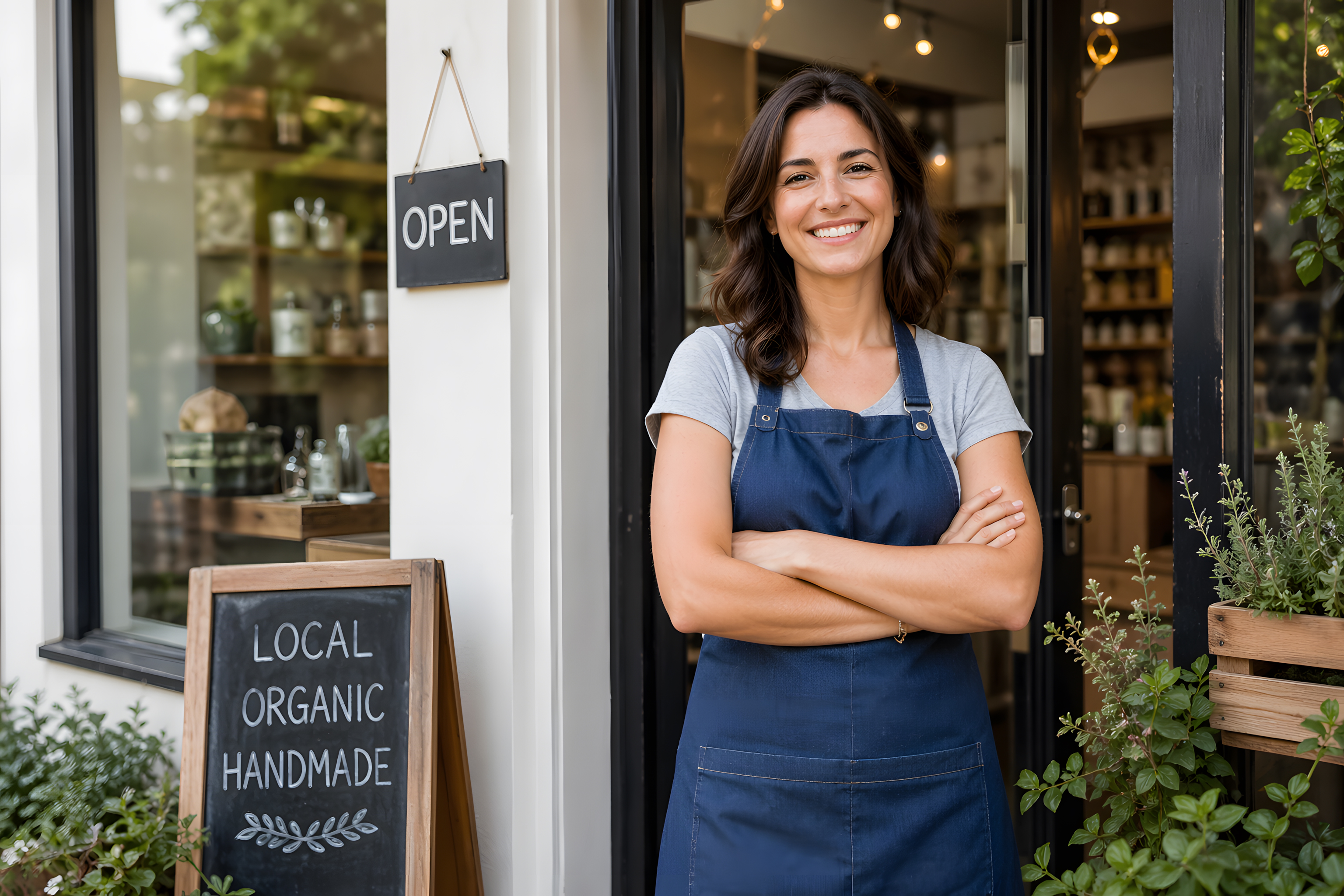 Dieses Foto zeigt eine selbstbewusste Frau mit dunklen Haaren, die lächelnd mit verschränkten Armen vor dem Eingang ihres kleinen Ladengeschäfts steht. Sie trägt eine blaue Schürze über einem grauen T-Shirt und wirkt einladend und professionell zugleich.