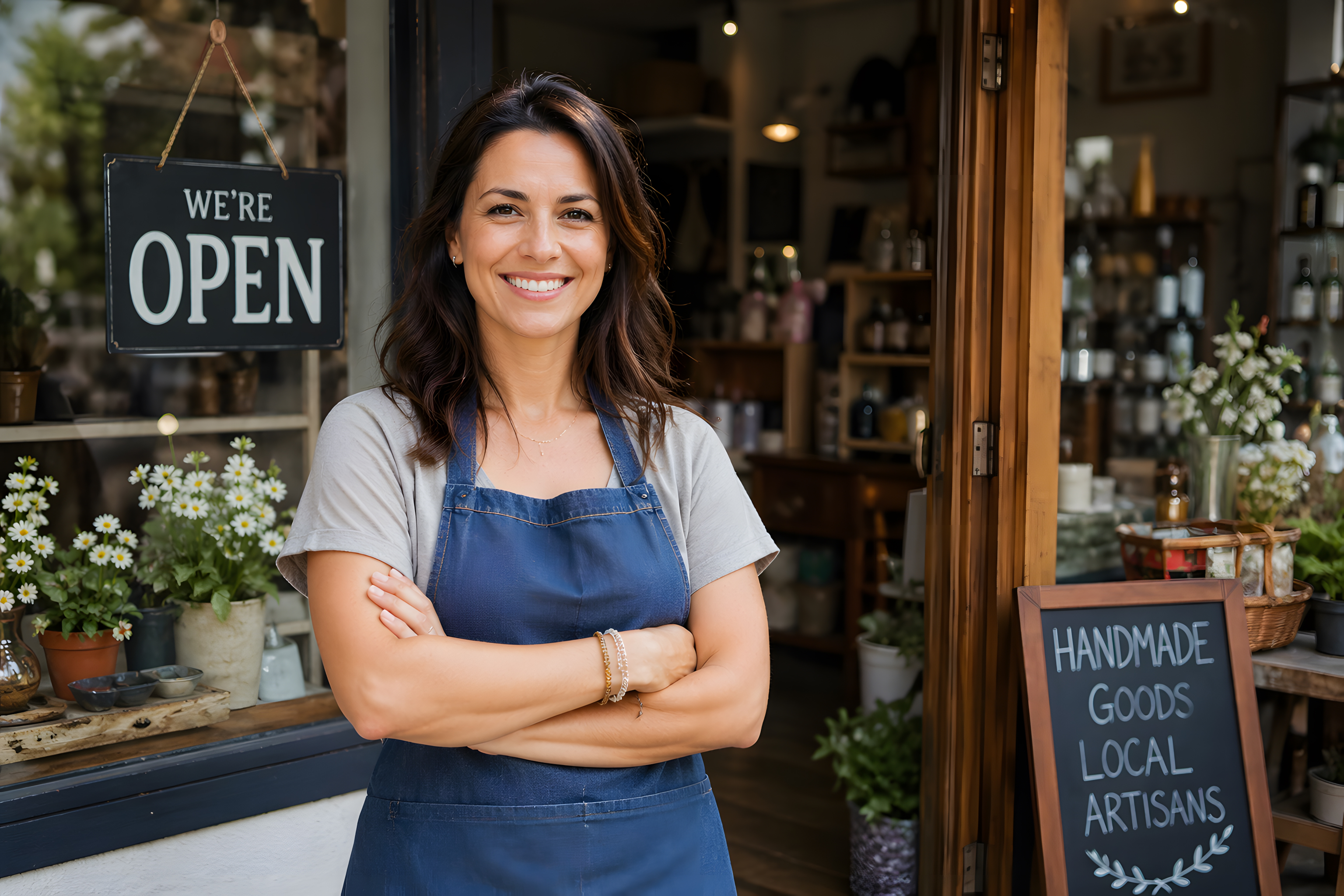 Im Hintergrund ist ein klassisches «We're Open»-Schild an der Fensterscheibe zu sehen, sowie eine Kreidetafel mit der Aufschrift «Handmade Goods Local Artisans». Der Eingangsbereich ist liebevoll dekoriert mit Topfpflanzen, weißen Blumen und Regalen voller Produkte, was eine einladende und gemütliche Atmosphäre erzeugt.