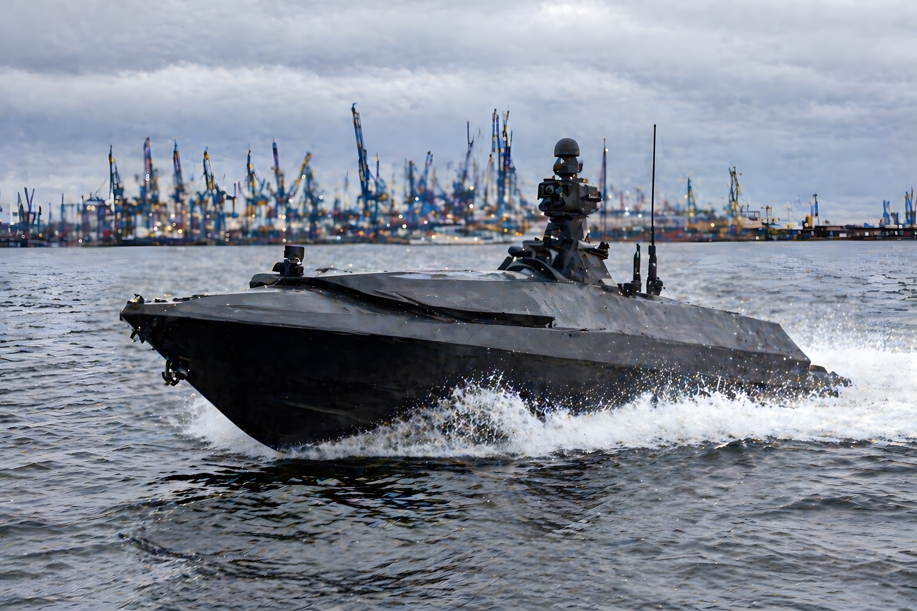 Das Bild eignet sich hervorragend für Berichte über moderne Marinetechnologie, autonome Waffensysteme und maritime Sicherheit. Es kann in Fachartikeln, Präsentationen zur Verteidigungstechnologie, Nachrichtenportalen, Newslettern zum Thema Militär sowie in Social-Media-Beiträgen über Seestreitkräfte und Drohnentechnologie eingesetzt werden. Die kontrastreiche Komposition mit dem dunklen Boot vor dem industriellen Hafenhintergrund macht das Bild besonders wirkungsvoll.