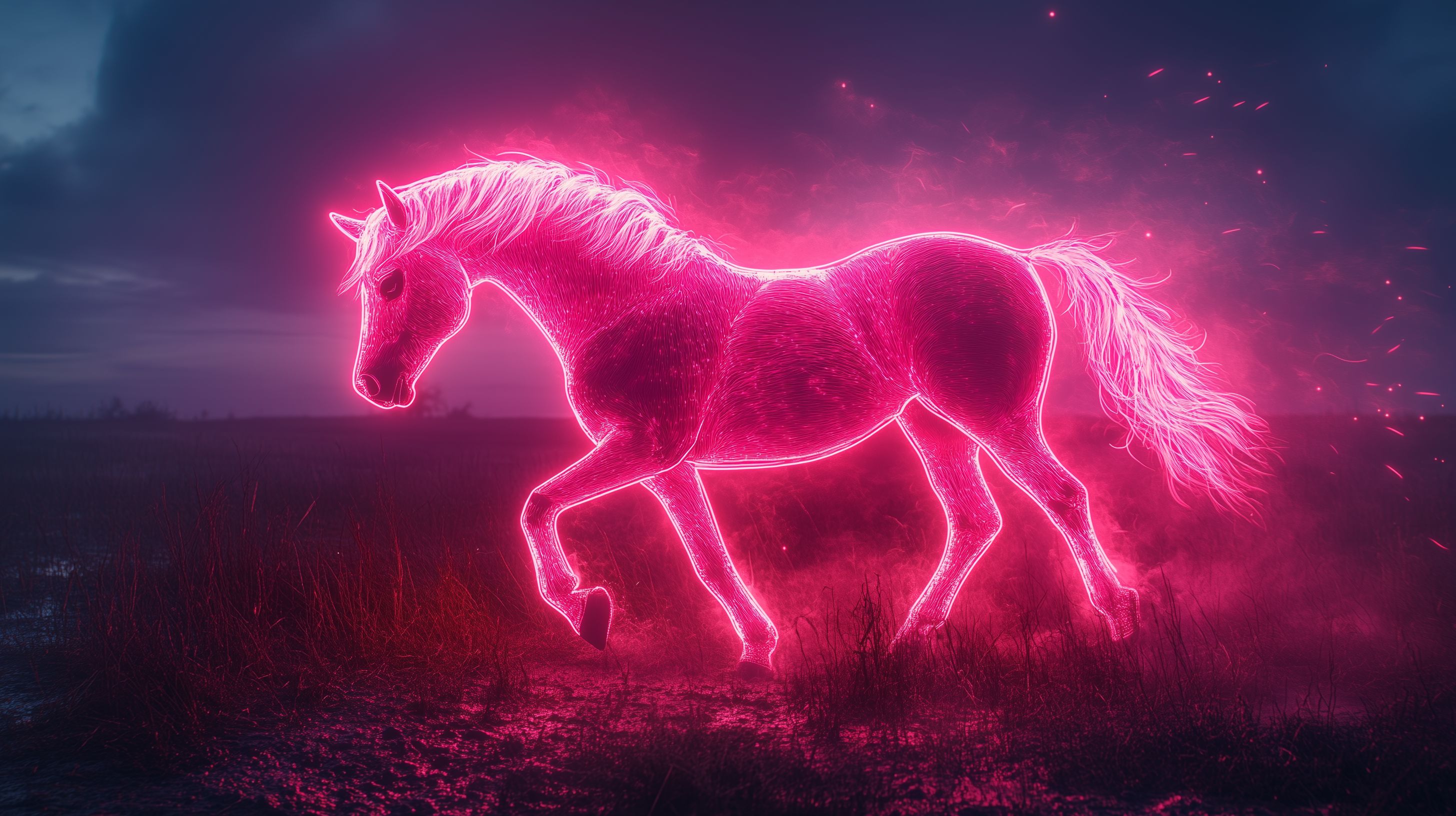 Dieses beeindruckende Digitalbild zeigt ein leuchtend pinkes Fantasie-Pferd, das durch eine neblige Nachtlandschaft galoppiert. Die glühende Silhouette des Pferdes hebt sich vor einem mystischen, dunkel-lila gefärbten Himmel ab, durchzogen von Funken und Partikeleffekten. Die Szene strahlt eine geheimnisvolle, fast magische Stimmung aus und lässt den Betrachter in eine imaginäre Welt eintauchen.