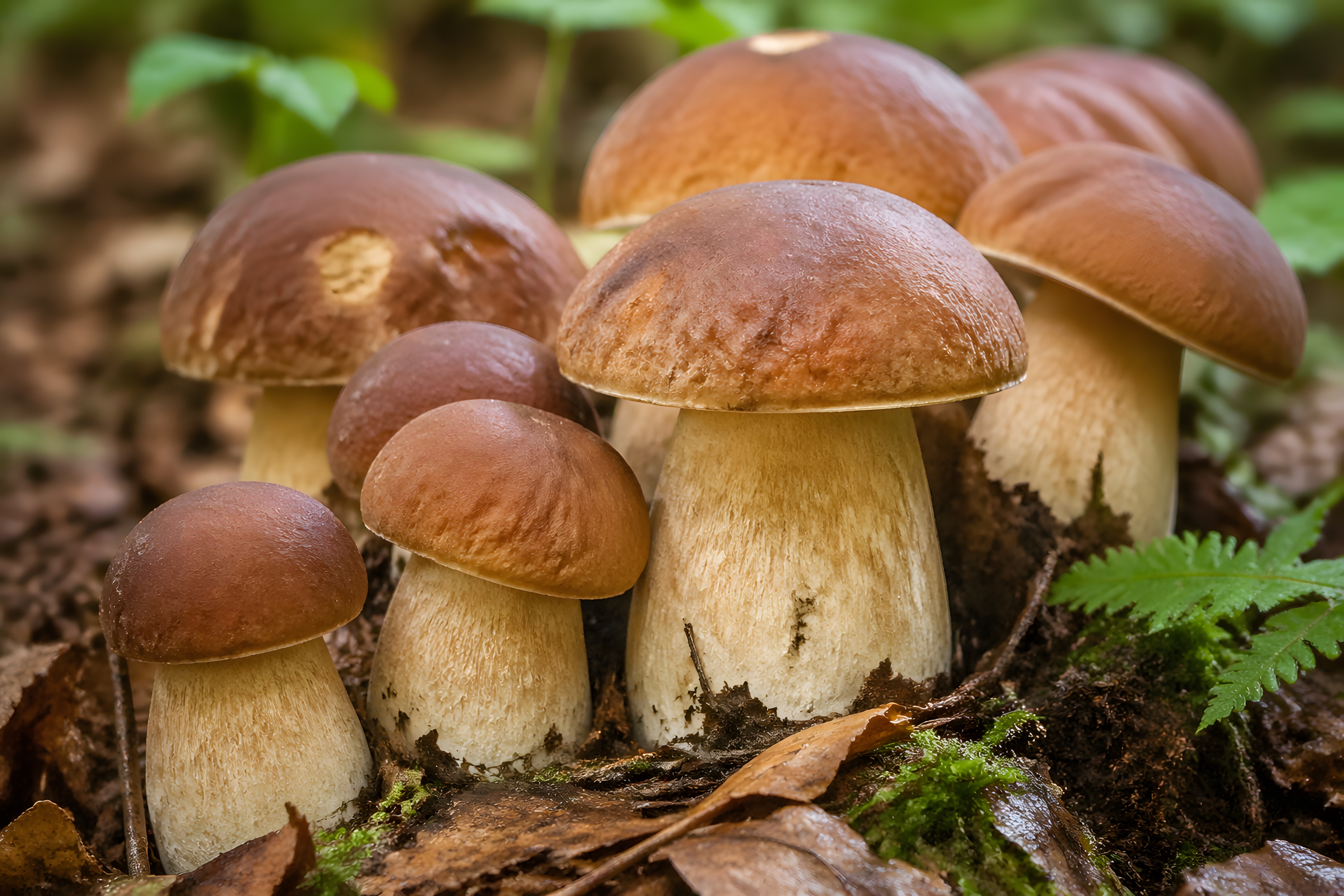 Die Komposition ist bodennah und frontalperspektivisch aufgenommen, was den Betrachter direkt in die Waldszene eintauchen lässt. Sattes Moos, feuchtes Herbstlaub und zarte Farnpflanzen rahmen die Pilzgruppe natürlich ein. Die weiche Hintergrundunschärfe lenkt den Blick gezielt auf die Pilze im Vordergrund. Das diffuse, natürliche Licht betont die samtige Textur der Hüte und die feinen Details der Stiele.