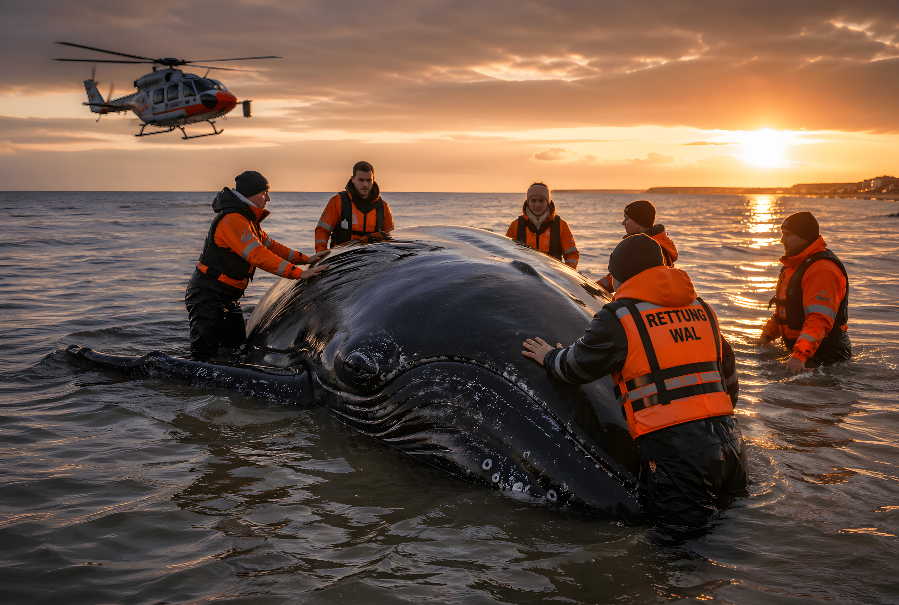 Dieses eindrucksvolle Foto zeigt eine dramatische Rettungsaktion an der Küste: Mehrere Einsatzkräfte in orangefarbenen Schutzwesten mit der Aufschrift «Rettung Wal» stehen im flachen Wasser und versuchen gemeinsam, einen großen Buckelwal zu retten. Die Szene spielt sich bei einem atmosphärischen Sonnenuntergang ab, der den Himmel in warme Gold- und Orangetöne taucht und sich im Wasser spiegelt.
