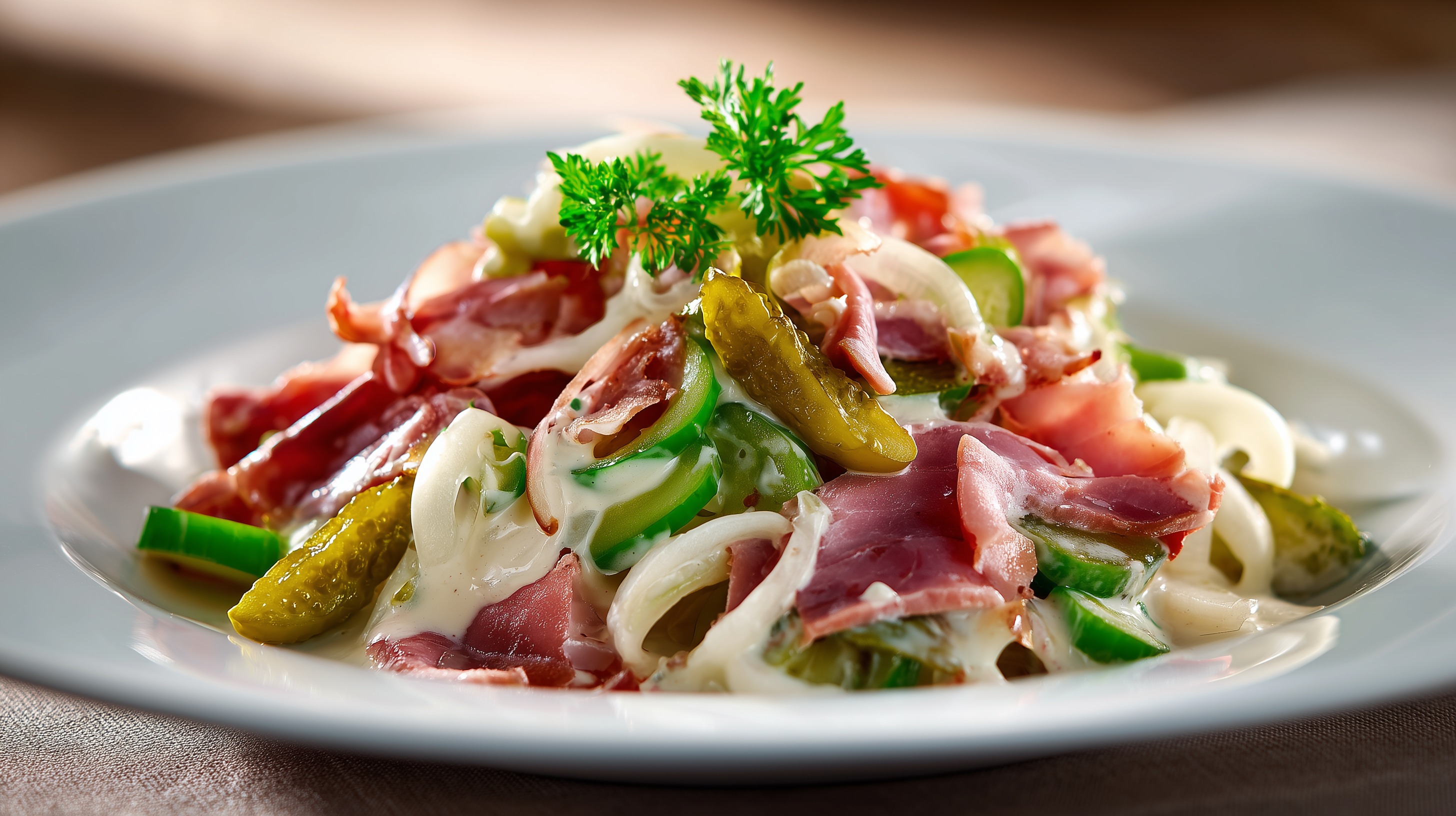 Tipp: Der Fleischsalat schmeckt am besten, wenn er über Nacht im Kühlschrank durchzieht. Er passt hervorragend zu frischem Bauernbrot oder Brötchen und eignet sich auch wunderbar als Füllung für Sandwiches oder als Beilage zu einem Grillbuffet.