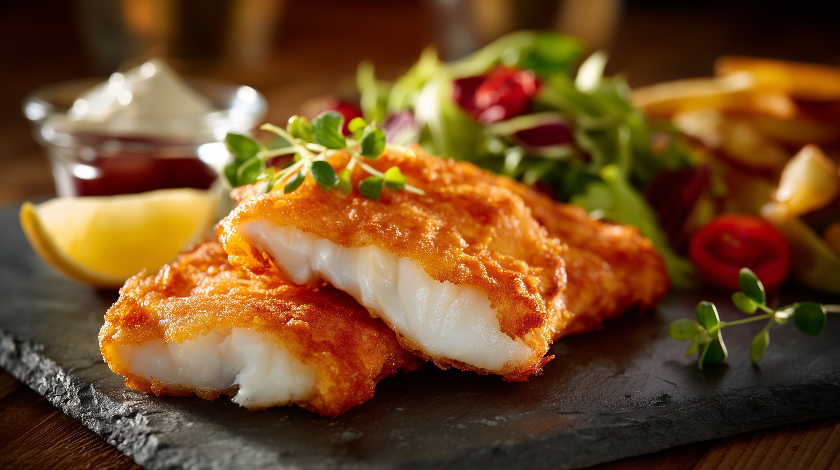 - Die Schieferplatten leicht anwärmen (unter warmem Wasser abspülen und abtrocknen). Je zwei Fischstücke auf einer Schieferplatte anrichten, mit frischer Kresse oder Thymianzweigen garnieren, Zitronenspalten dazulegen und den Blattsalat seitlich anrichten. Remoulade in einem kleinen Schälchen dazu servieren.