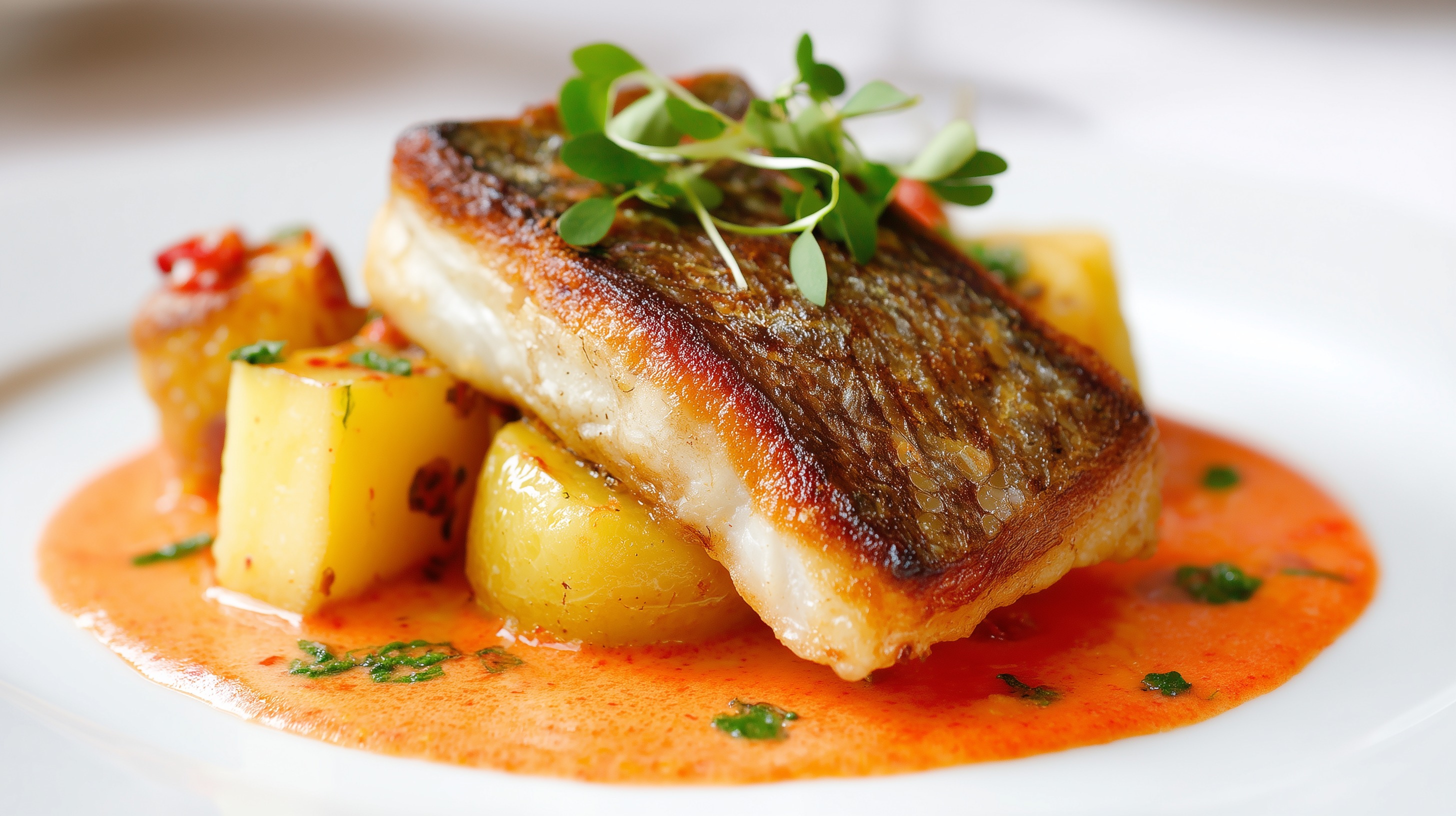 Tipp: Damit die Haut des Wolfsbarschs perfekt knusprig wird, müssen die Filets vor dem Braten unbedingt mit Küchenpapier trocken getupft werden. Außerdem sollte die Pfanne richtig heiß sein, bevor der Fisch eingelegt wird – so klebt die Haut nicht an und wird schön kross. Die Paprikasauce lässt sich wunderbar einen Tag im Voraus zubereiten und sanft aufgewärmt servieren.