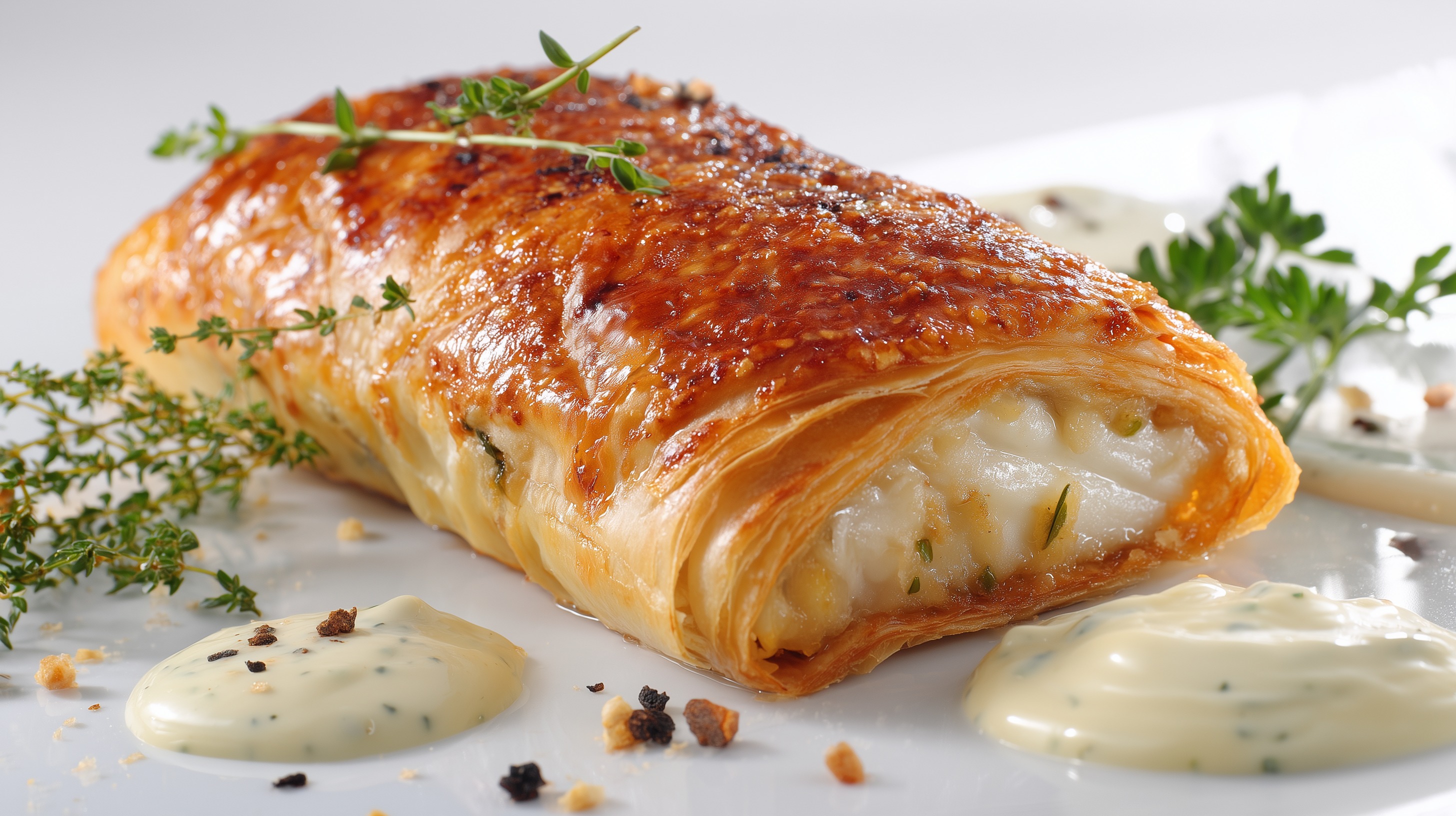 - Anrichten: Die Strudelröllchen auf vorgewärmten Tellern anrichten. Die Kräutersauce seitlich dazu gießen oder darunter verteilen. Mit frischen Kräuterzweigen und etwas Zitronenschale garnieren. Sofort servieren.