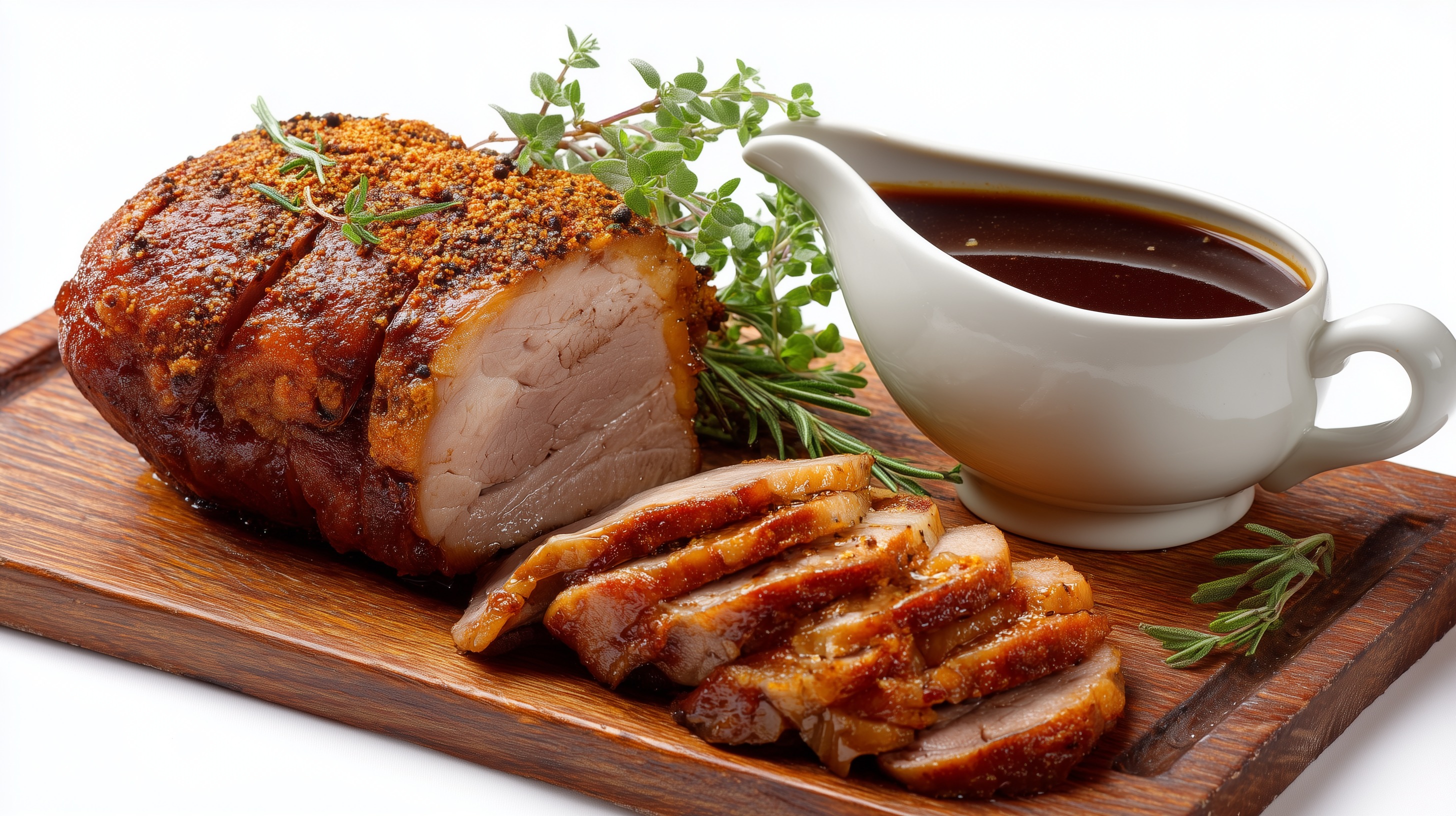 - Das Fleisch in dünne Scheiben aufschneiden, auf einem Holzbrett anrichten. Die Jus in einem weißen Saucier dazustellen. Mit frischen Rosmarin- und Thymianzweigen garnieren und sofort servieren.