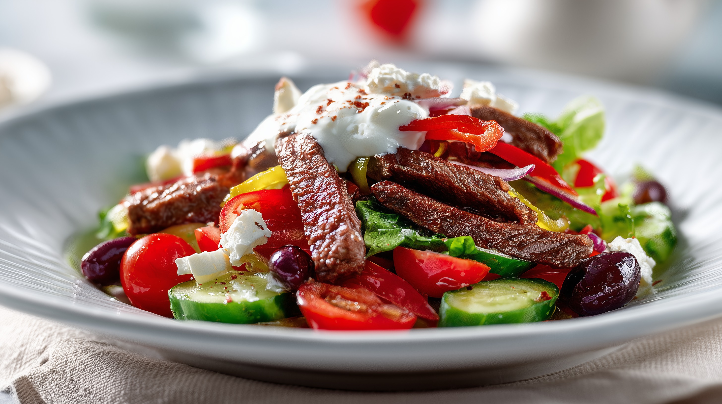 - Das gebratene Gyros-Fleisch auf dem Salat anrichten, einen großzügigen Klecks Joghurt-Dip darüber geben und mit Sumac oder Paprikapulver bestreuen. Sofort servieren.