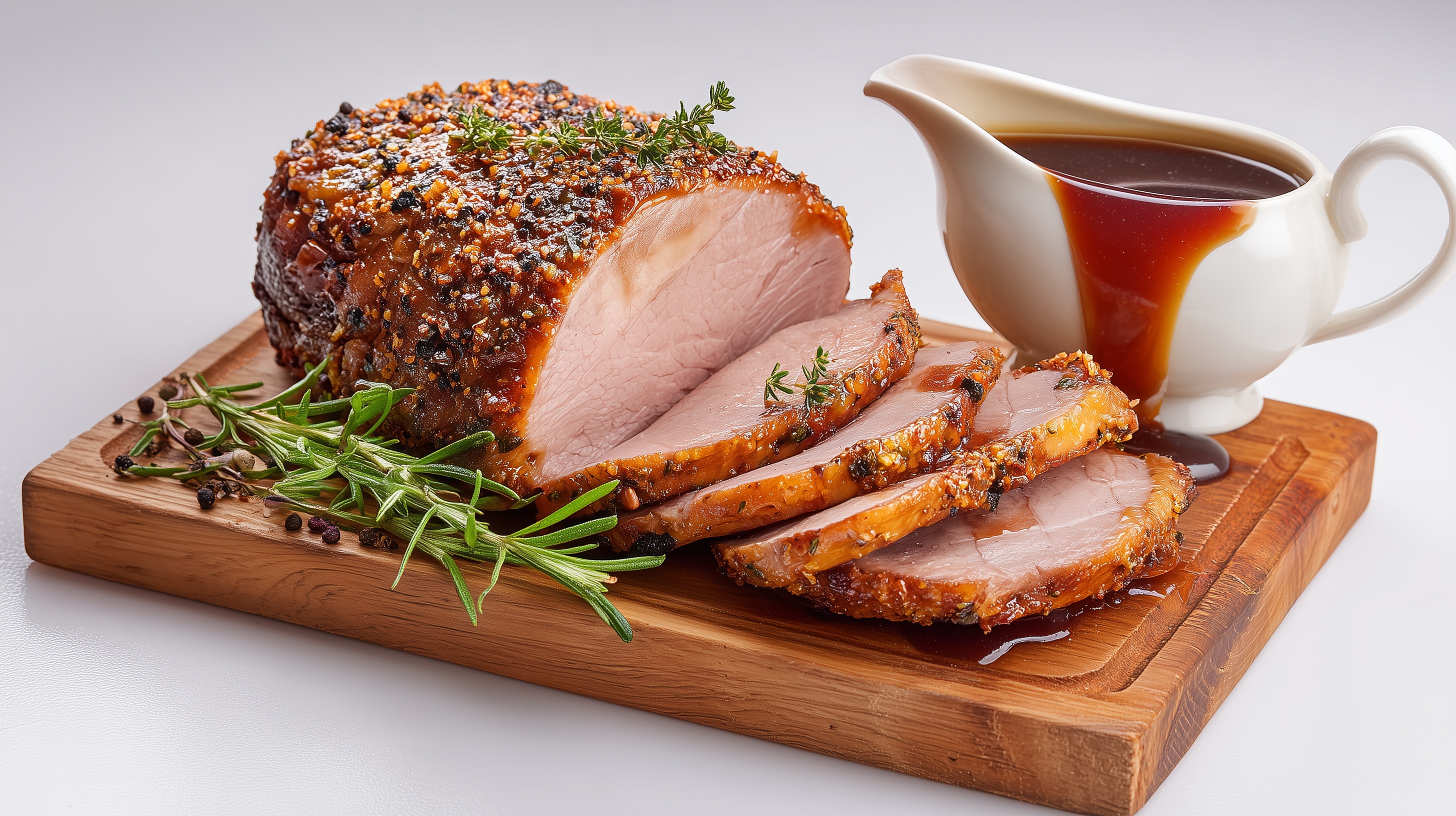 - Den Braten in gleichmäßige Scheiben schneiden, auf einem Holzbrett anrichten, mit frischem Thymian garnieren und die Jus separat in einer Sauciere dazu servieren.