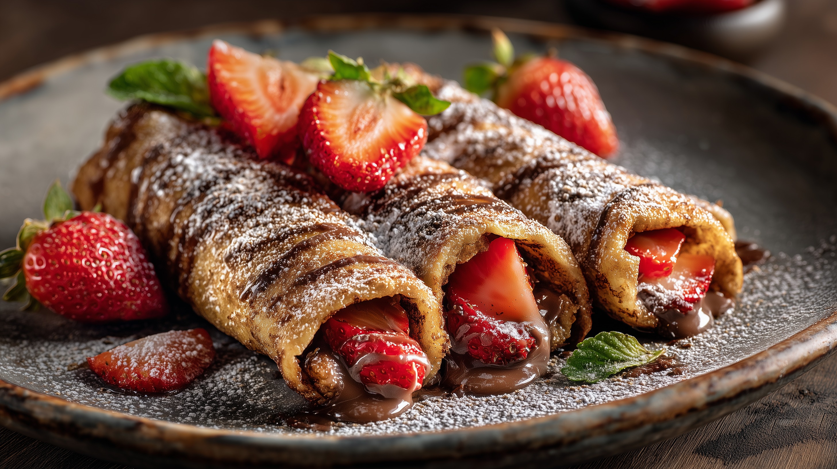 - Mit Puderzucker bestäuben, restliche Erdbeeren und Minzblätter dekorativ anrichten. Nach Wunsch etwas zusätzliche Schokoladensauce darüberträufeln.