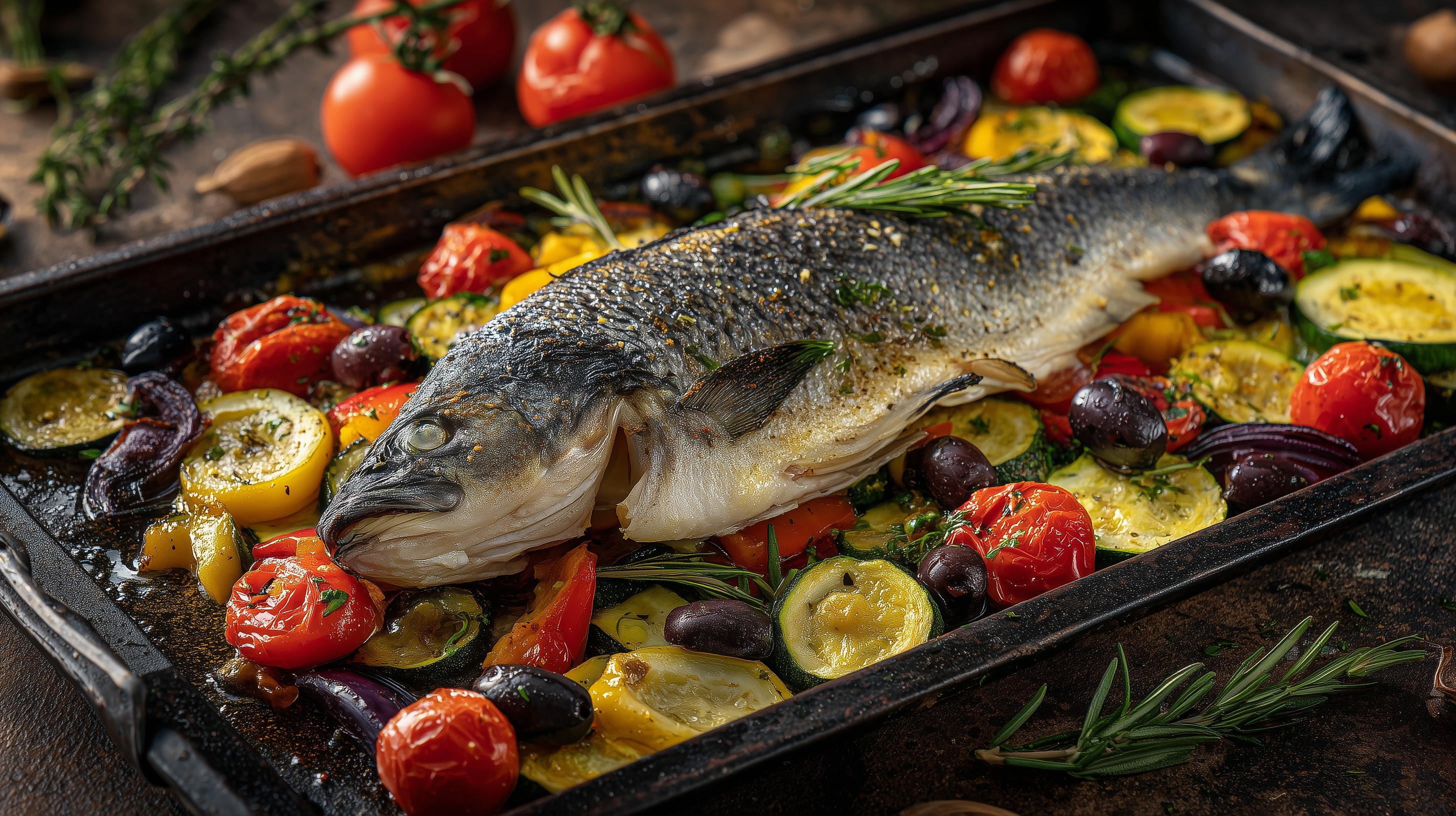 - Das Blech aus dem Ofen nehmen, kurz ruhen lassen und die Wolfsbarsche direkt auf dem Blech mit dem bunten Gemüse servieren. Mit frischer Zitrone und nach Wunsch mit Brot oder Ciabatta genießen.