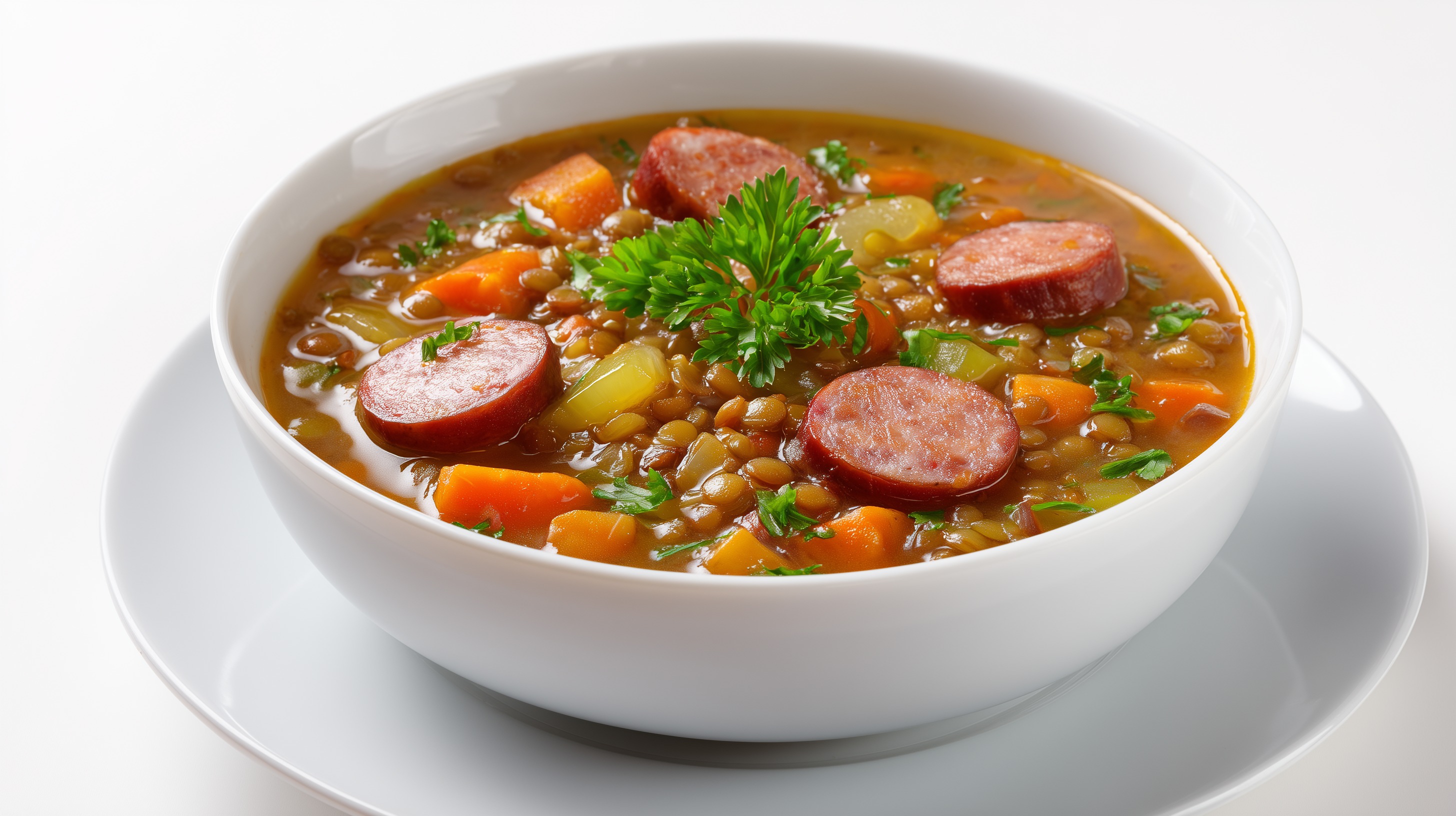 Tipp: Wer eine noch rauchigere Note möchte, kann einen Schuss Worcestershiresauce einrühren oder die Mettwürstchen durch geräucherte Chorizo ersetzen. Die Suppe schmeckt am nächsten Tag aufgewärmt noch aromatischer, da die Linsen mehr Geschmack aufnehmen – bei Bedarf etwas Brühe beim Erwärmen nachgießen.