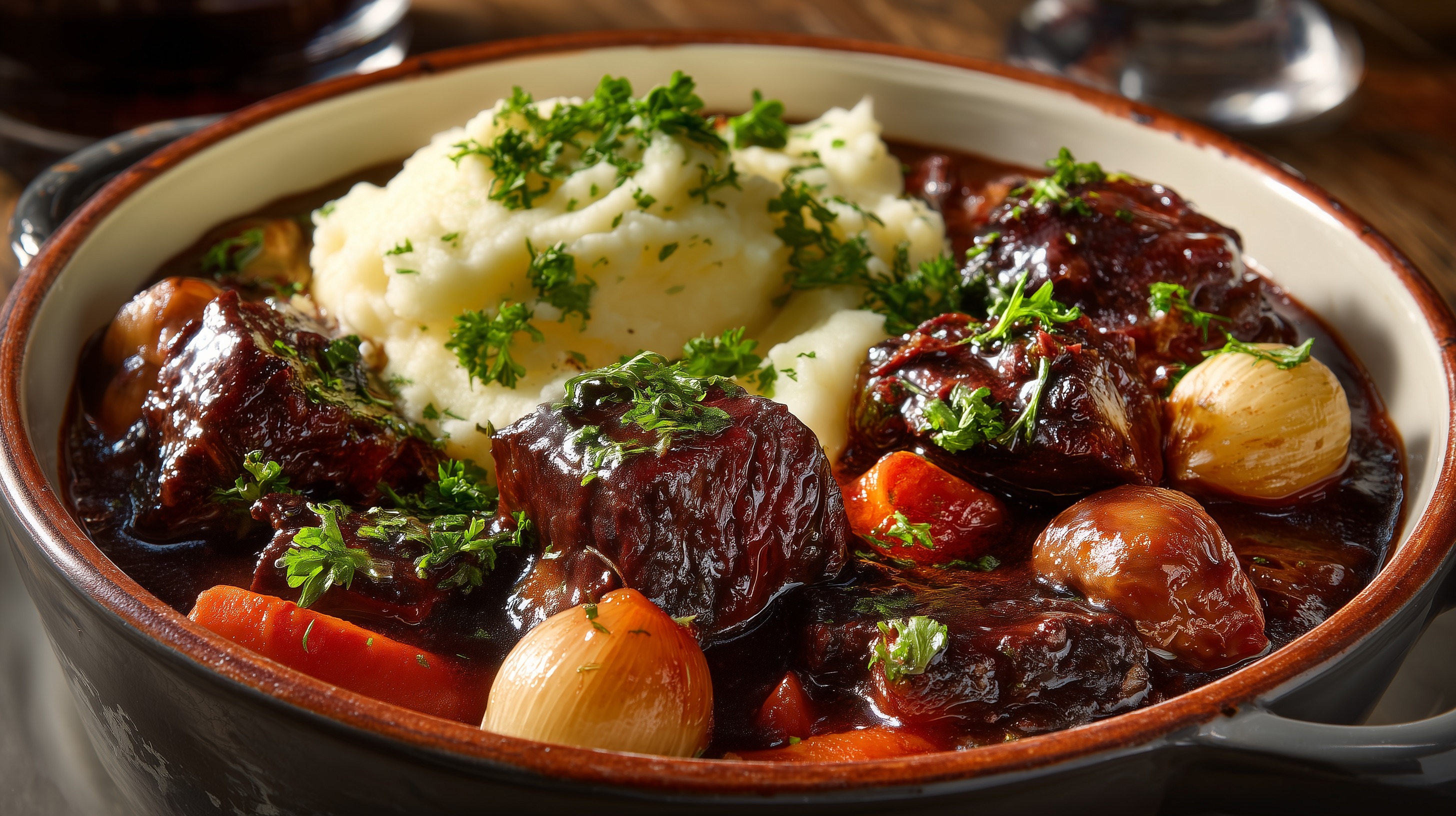 - Das Boeuf Bourguignon in tiefen Tellern oder im Schmortopf anrichten, Kartoffelpüree daneben setzen und mit frischer gehackter Petersilie bestreuen. Sofort servieren.