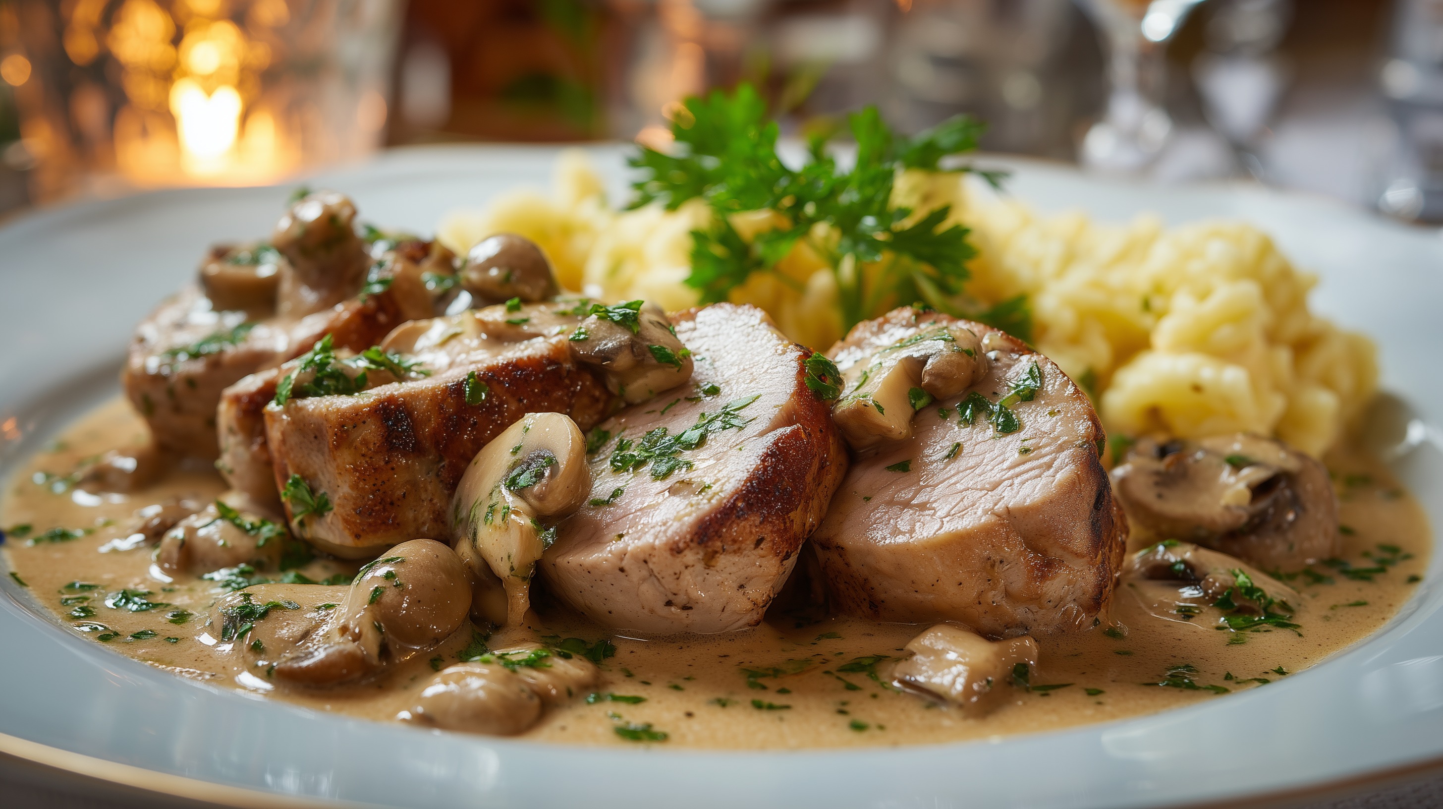 - Anrichten: Kartoffelstampf auf vorgewärmten Tellern anrichten, Medaillons mit reichlich Champignonrahmsauce darüber verteilen und großzügig mit frischer Petersilie bestreuen.