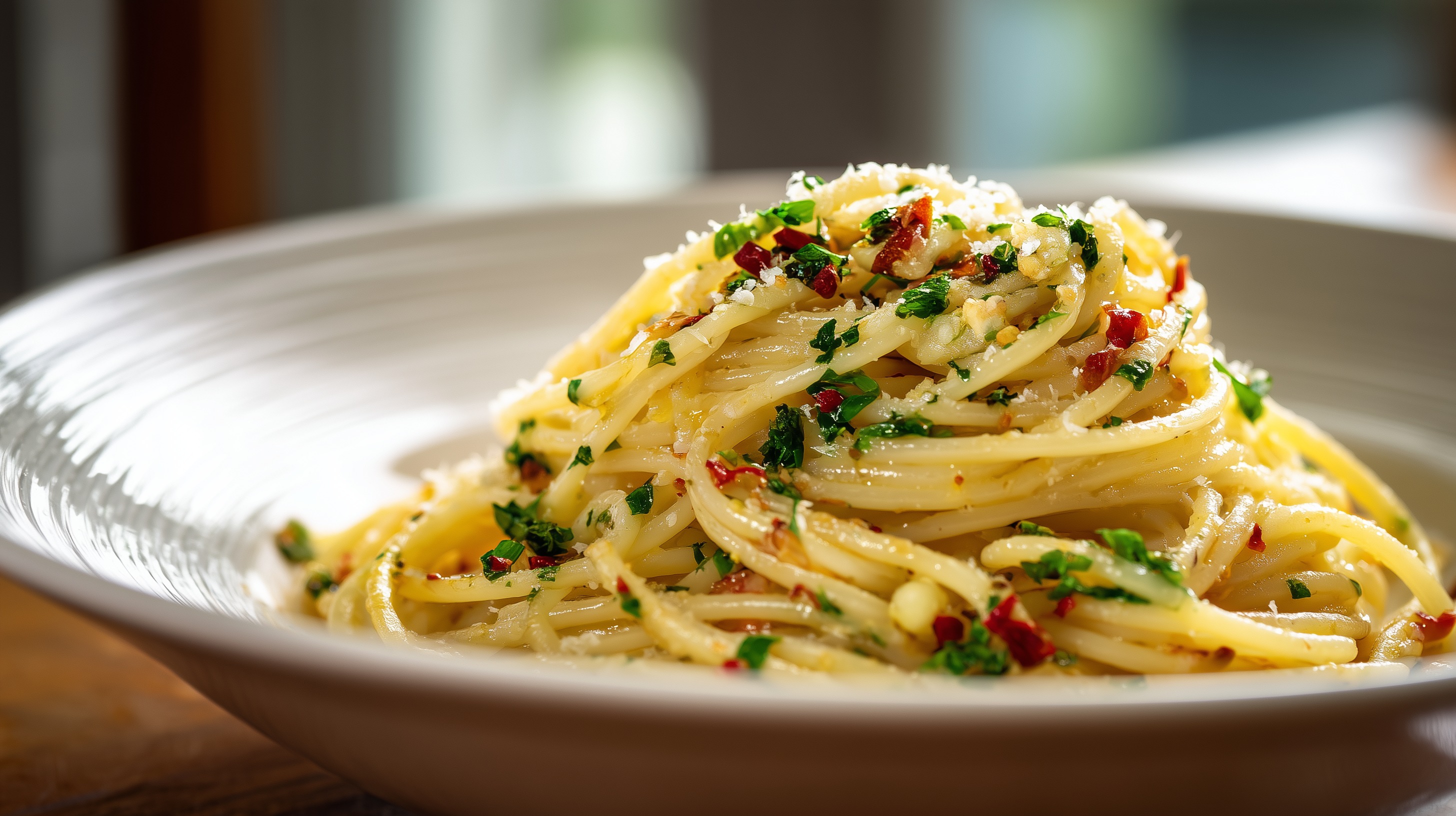 - Die Spaghetti auf vier vorgewärmte Teller verteilen, mit der restlichen Petersilie und etwas extra Parmesan garnieren. Optional den Zitronenabrieb darüberreiben und sofort servieren.