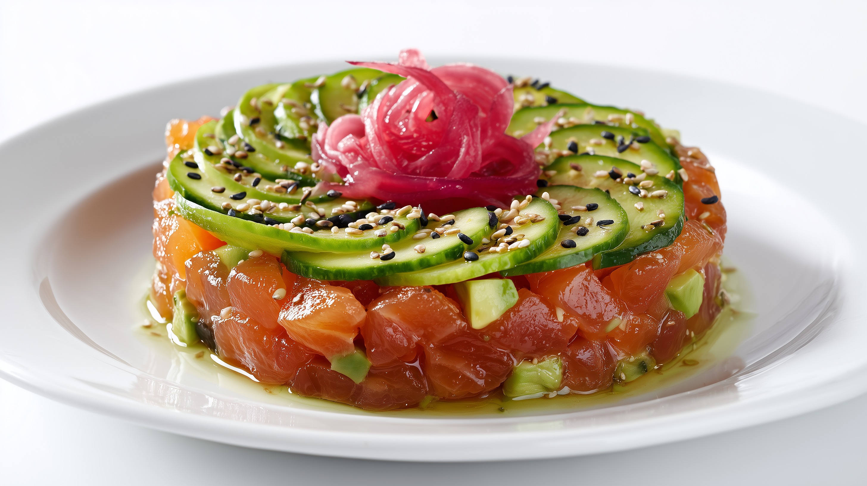- Anrichten: Einen runden Anrichtring (ca. 8 cm Durchmesser) auf einen Teller setzen. Das Lachstatar hineinfüllen und leicht andrücken. Die Gurkenscheiben und Avocadowürfel dekorativ darauf anordnen.