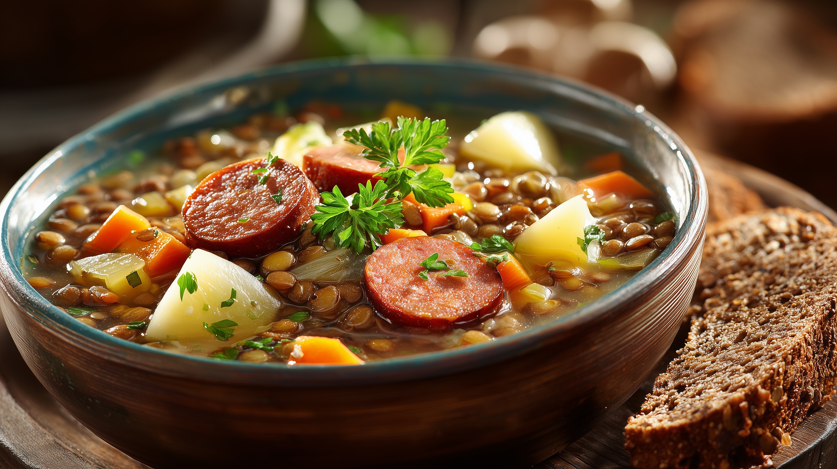 - Die Linsensuppe in tiefen Tellern anrichten, mit frisch gehackter Petersilie garnieren und mit kräftigem Brot (z. B. Roggenbrot) servieren.