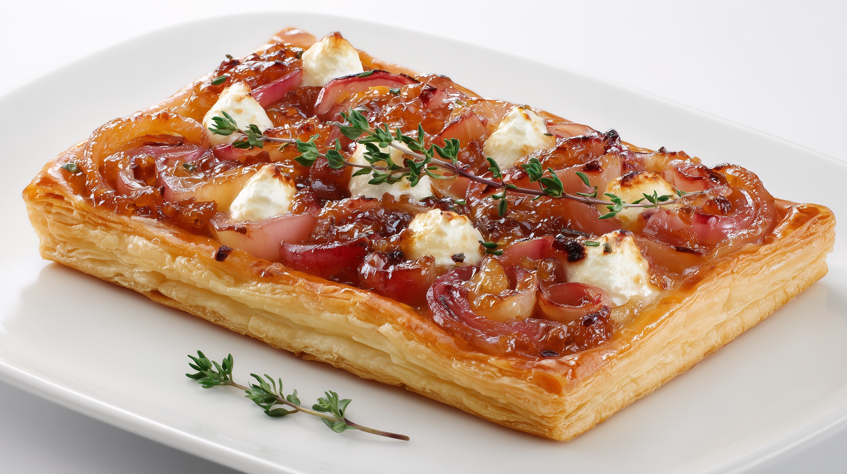 - Tarte belegen: Das Rhabarber-Chutney gleichmäßig auf der inneren Fläche des Blätterteigs verteilen. Die karamellisierten Zwiebeln darüber verteilen. Den Ziegenkäse in Stücke zupfen und auf der Tarte verteilen. Mit frischen Thymianblättern bestreuen und nach Belieben mit Salz und Pfeffer würzen.